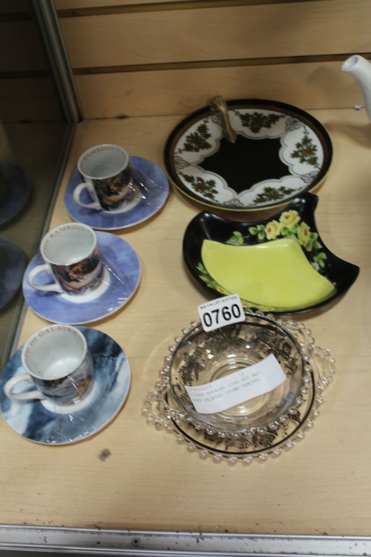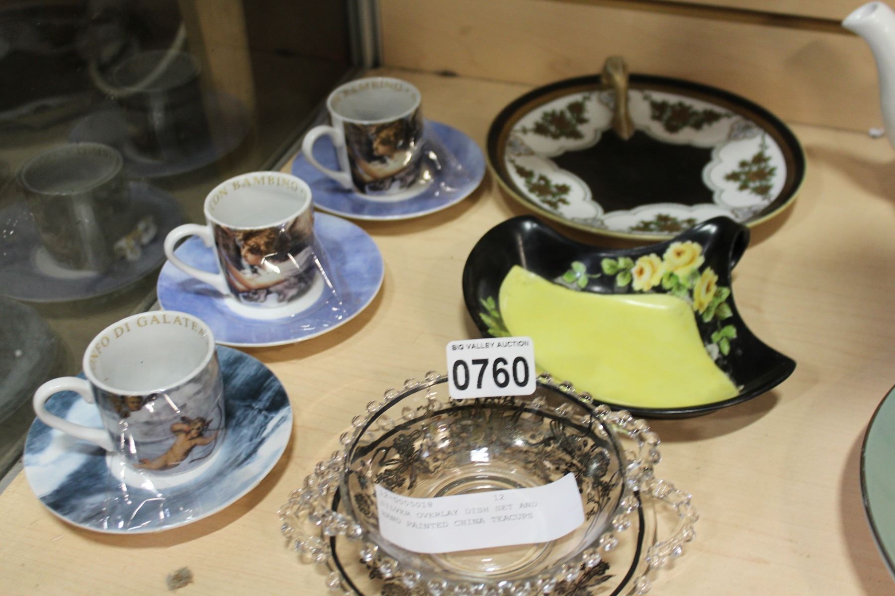 SILVER OVERLAY DISH SET AND HAND PAINTED CHINA TEACUPS