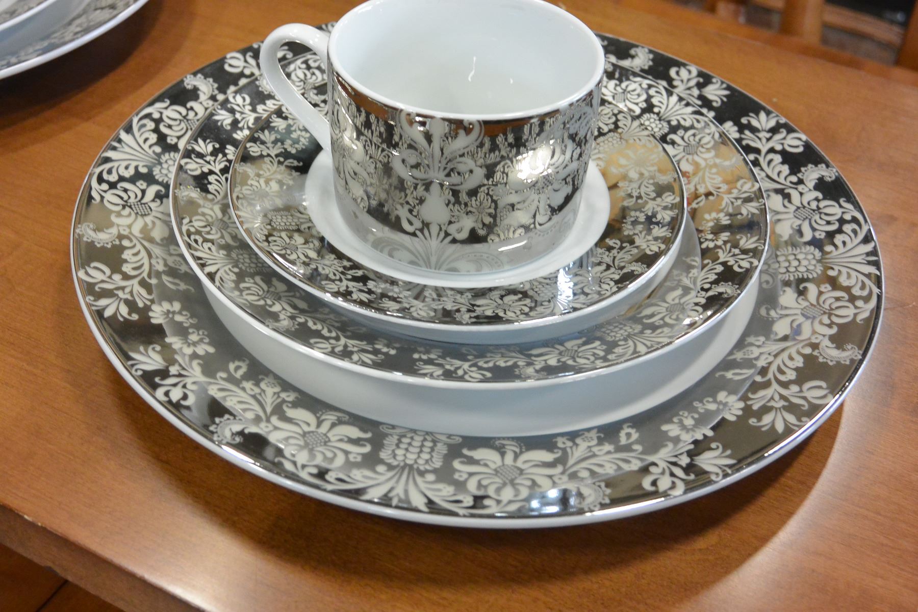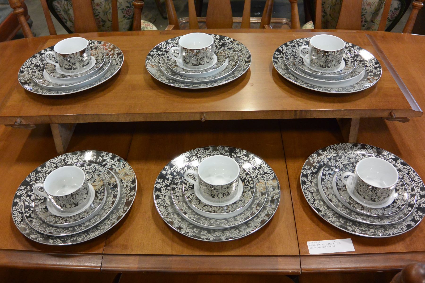 SILVER OVERLAY FINE CHINA DINNER SET, 6 PLACE SETTING, 24 PIECES,
