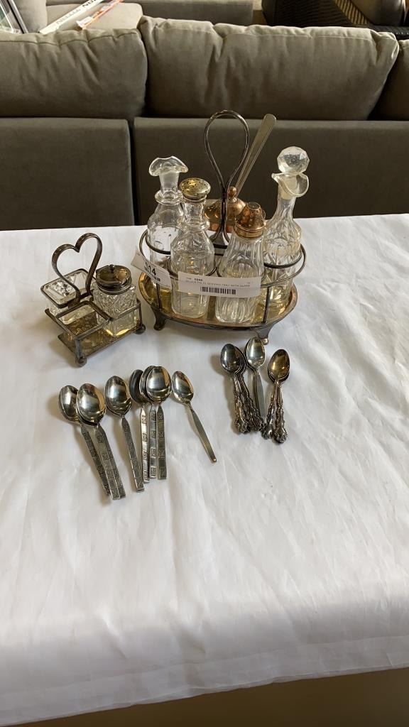 SILVER PALTE SERVING TRAY WITH GLASS CONDIMENT BOTTLES AND SILVER PLATE AND STAINLESS SPOONS