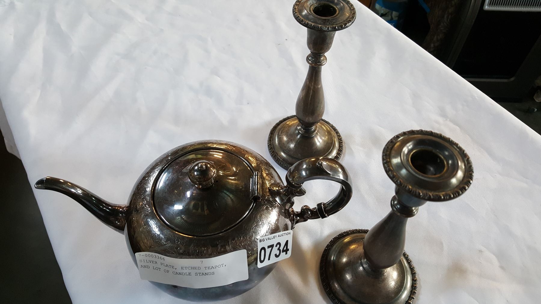 SILVER PLATE, ETCHED TEAPOT, AND LOT OF CANDLE STANDS