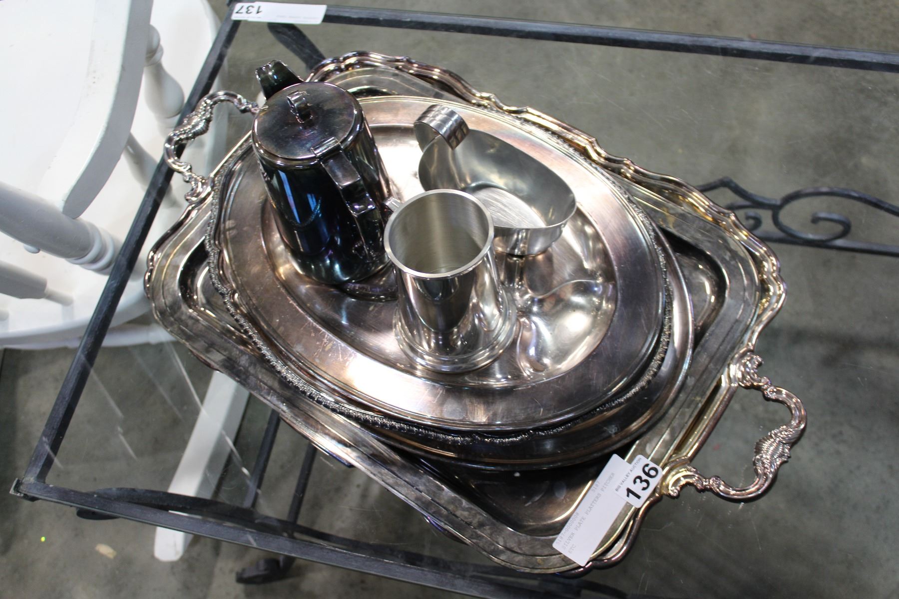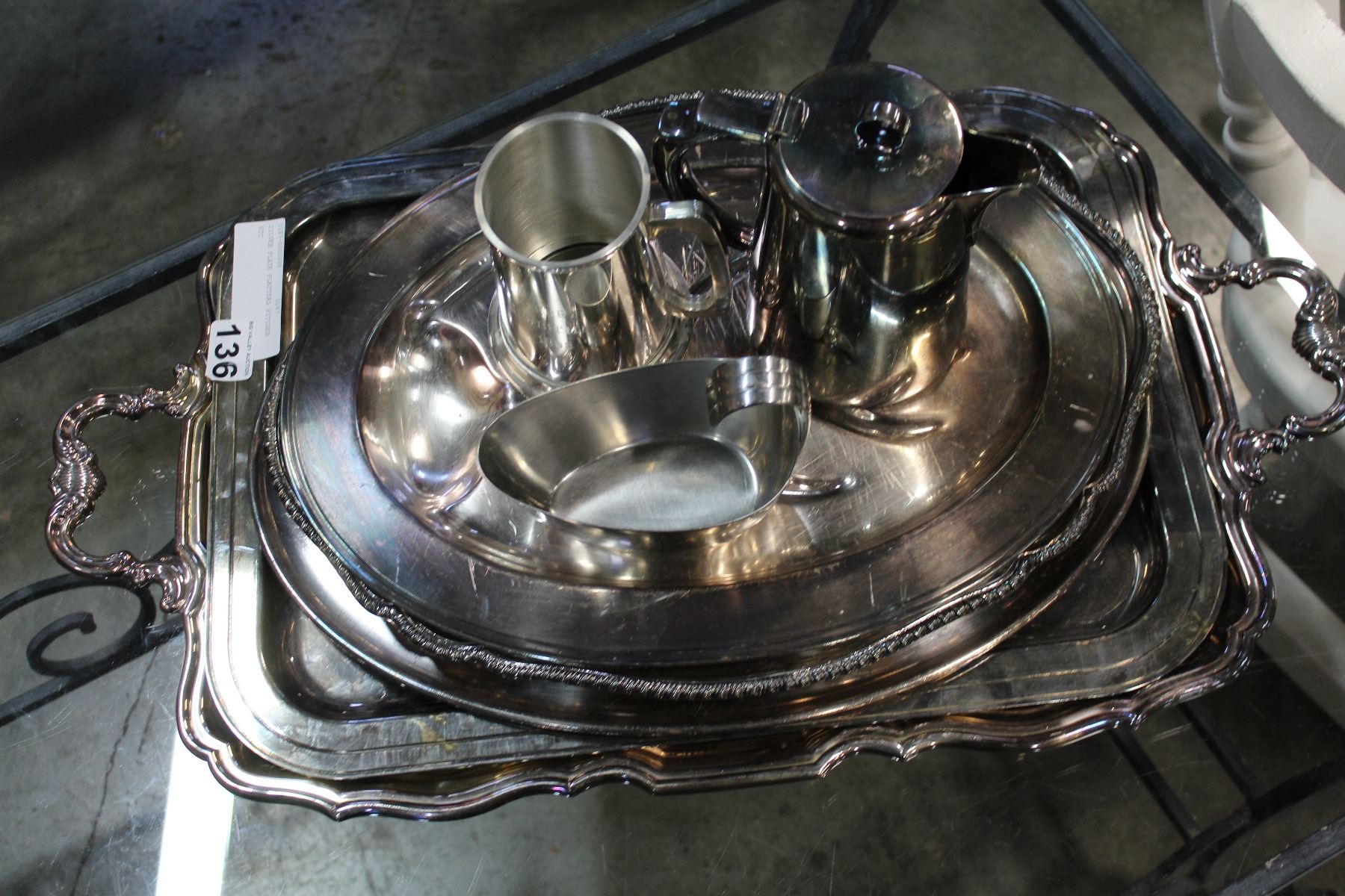 SILVER PLATE PLATTERS PITCHER ETC
