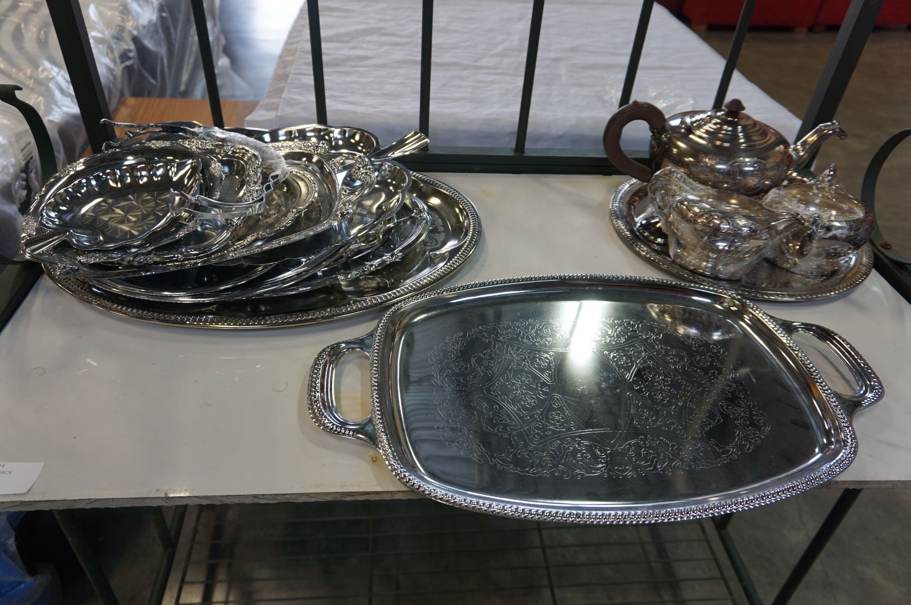 SILVER PLATE TEAPOT, CREAM AND SUGAR, AND SERVING TRAY