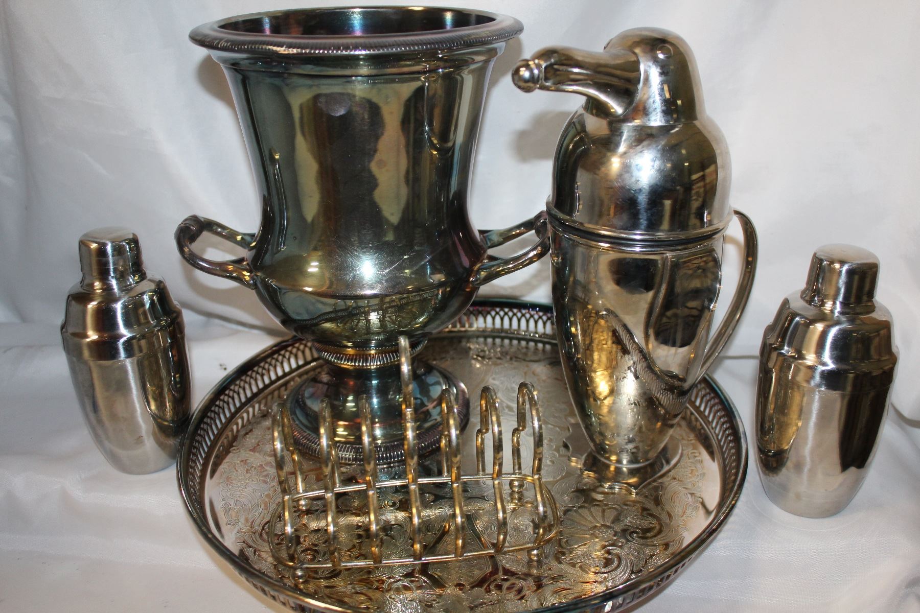 SILVER PLATE TRAY ICE BUCKET PENQUIN SHAKER ETC
