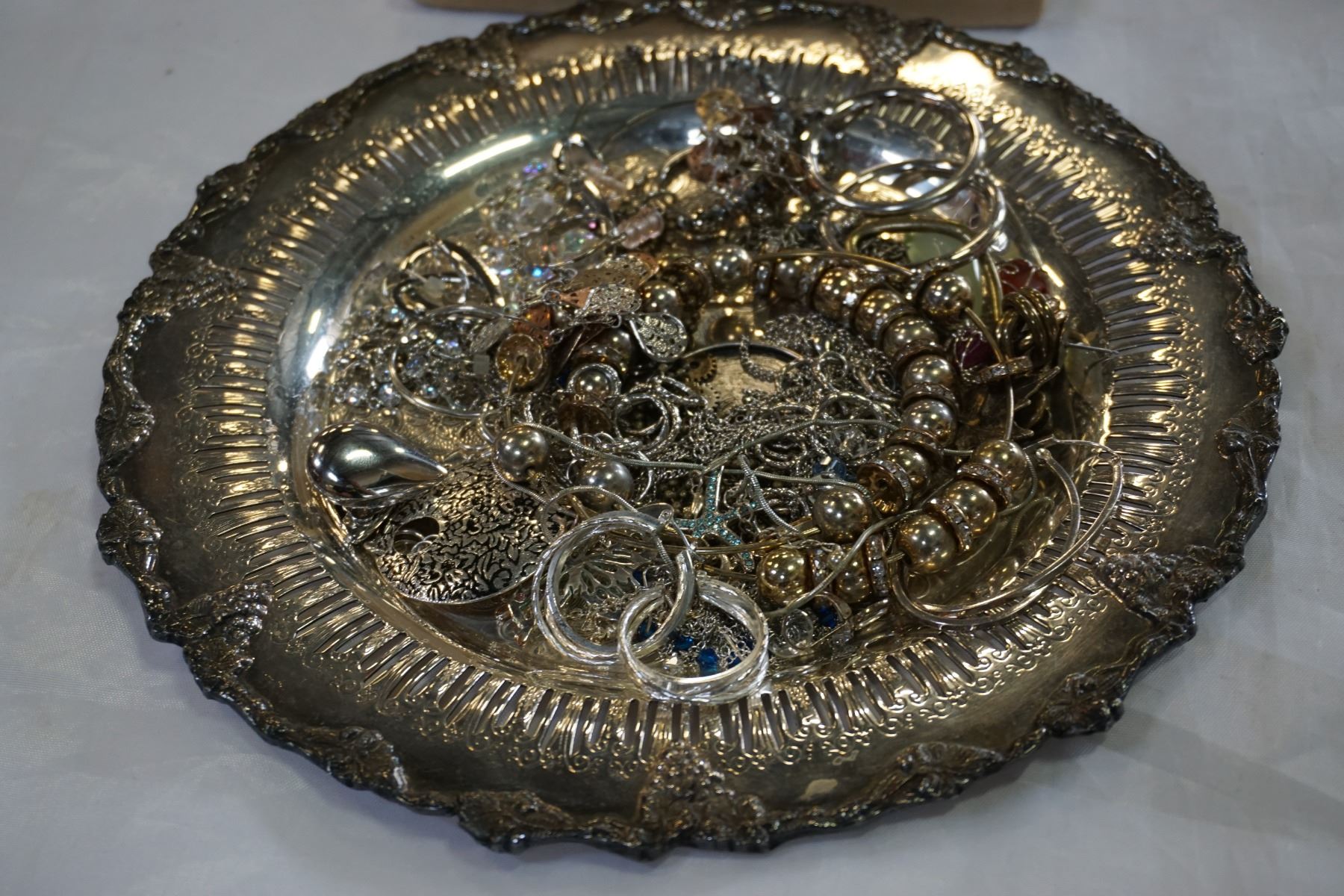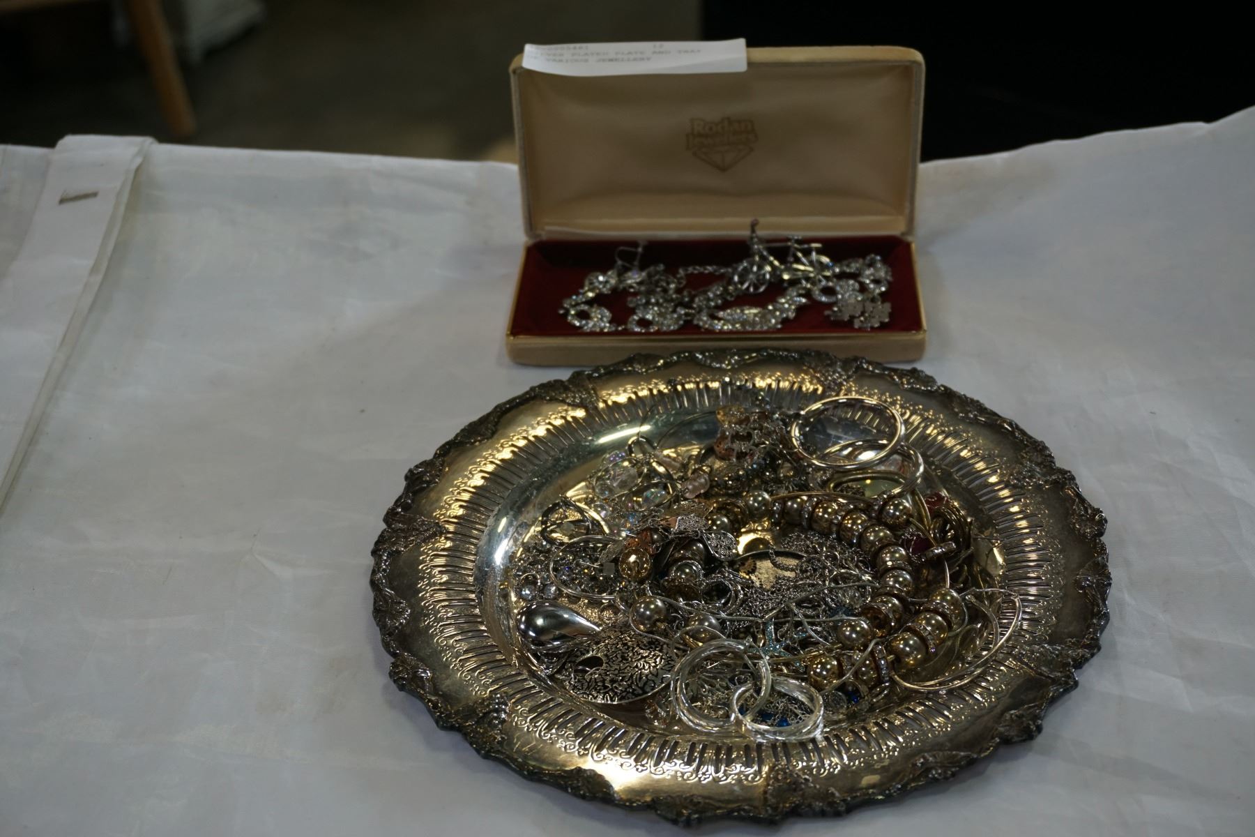 SILVER PLATED PLATE AND TRAY OF VARIOUS JEWELLERY
