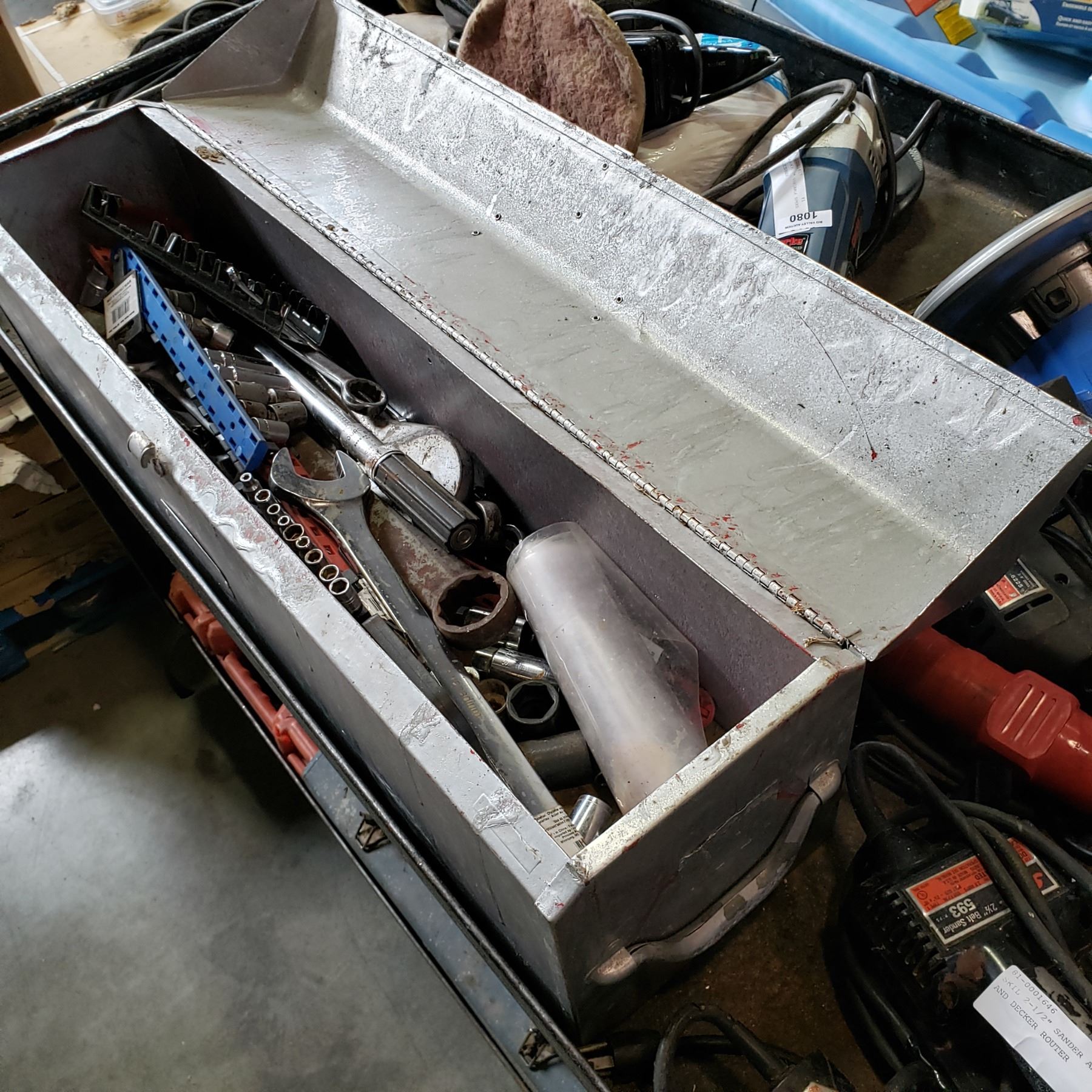 SILVER TOOL BOX W/ LARGE WRENCHES, TORQUE, WRENCH, ETC