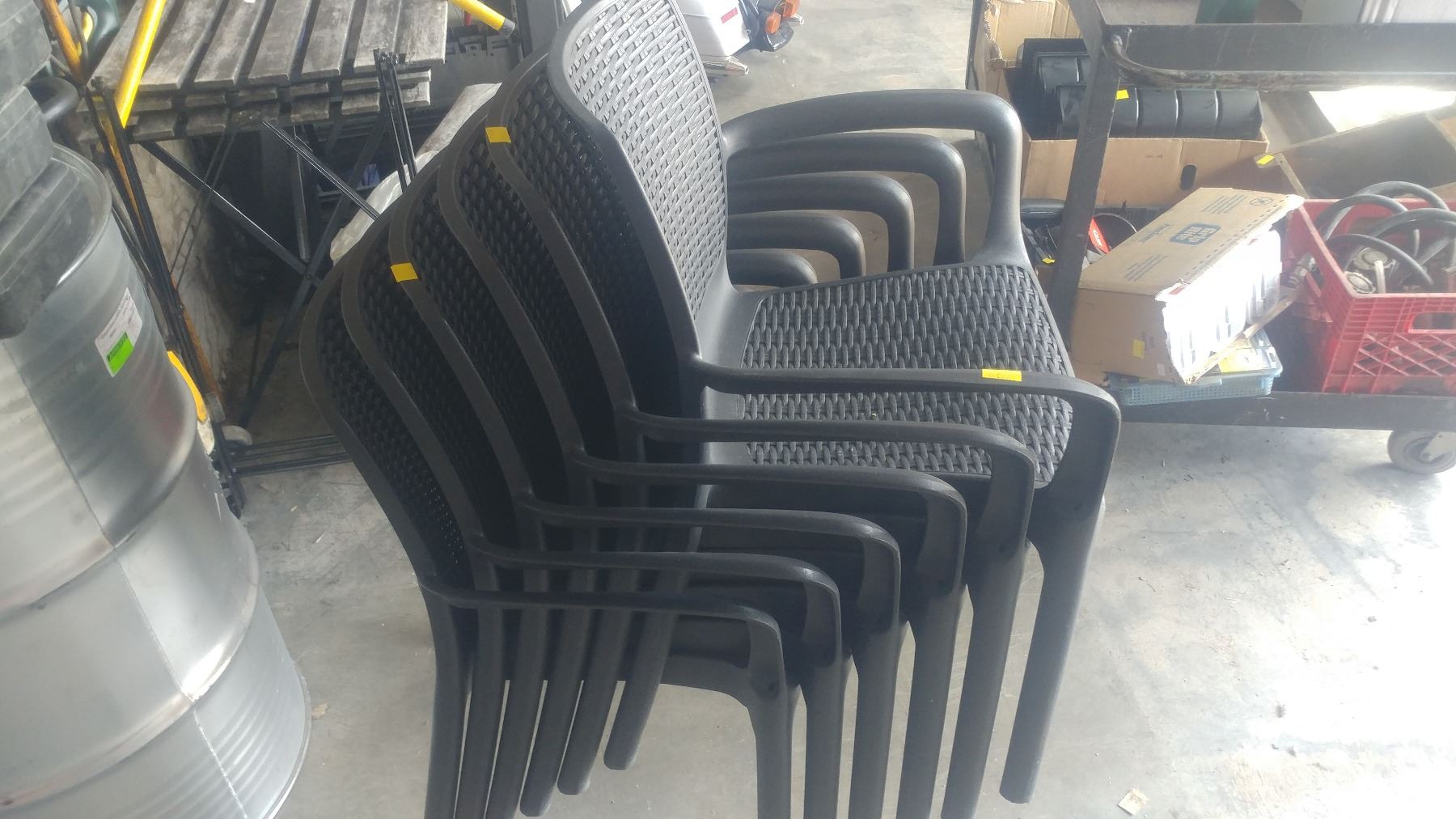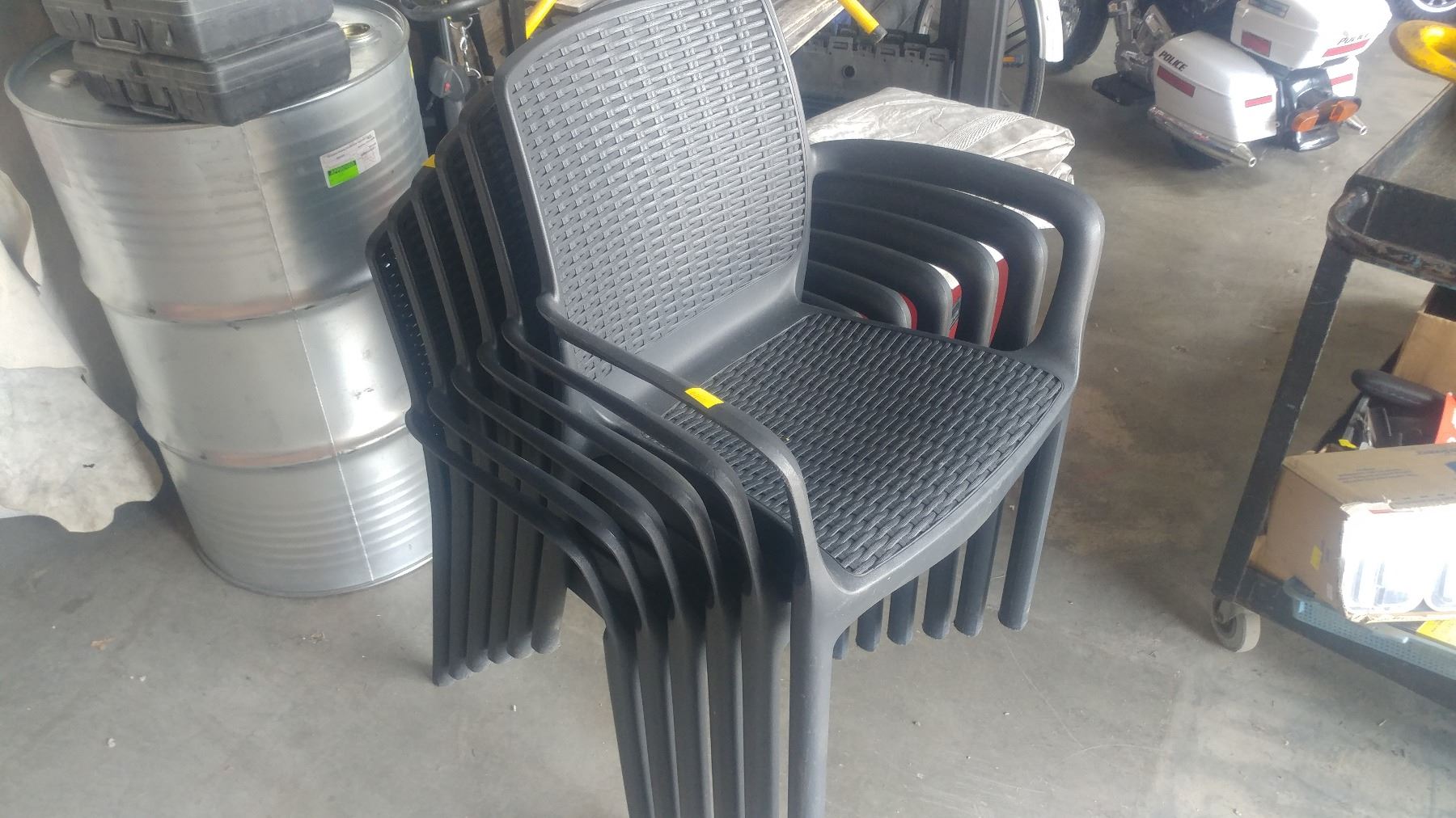 SIX BLACK PLASTIC PATIO CHAIRS