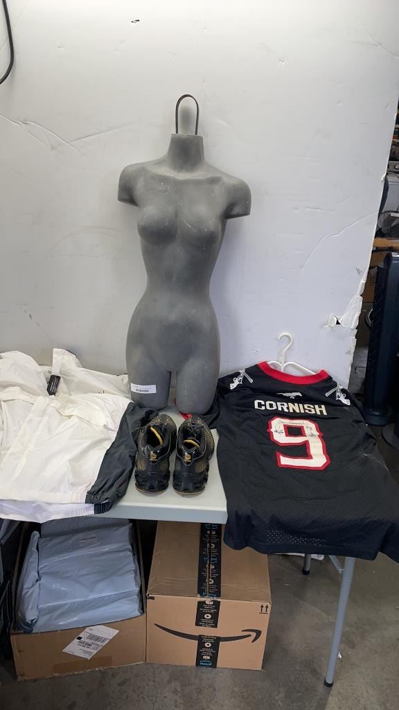 SIZE 11 NIKE CLEATS , CLOTHING DISPLAY FORM, JON CORNISH SIGNED JERSEY AND STORMTECH JACKET