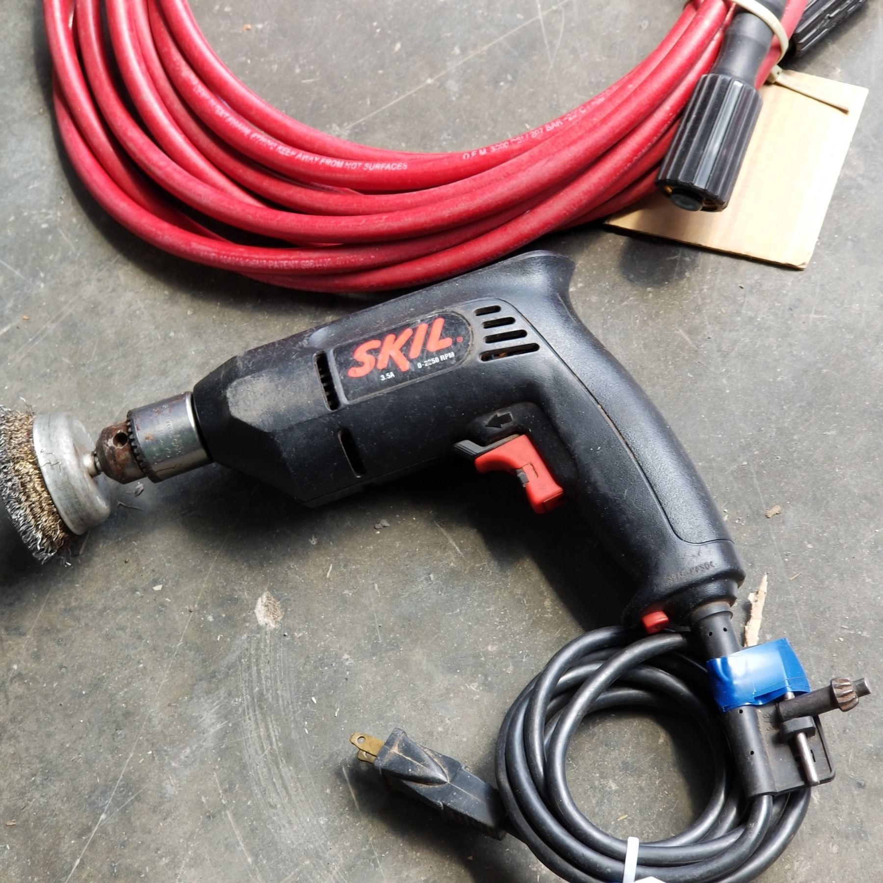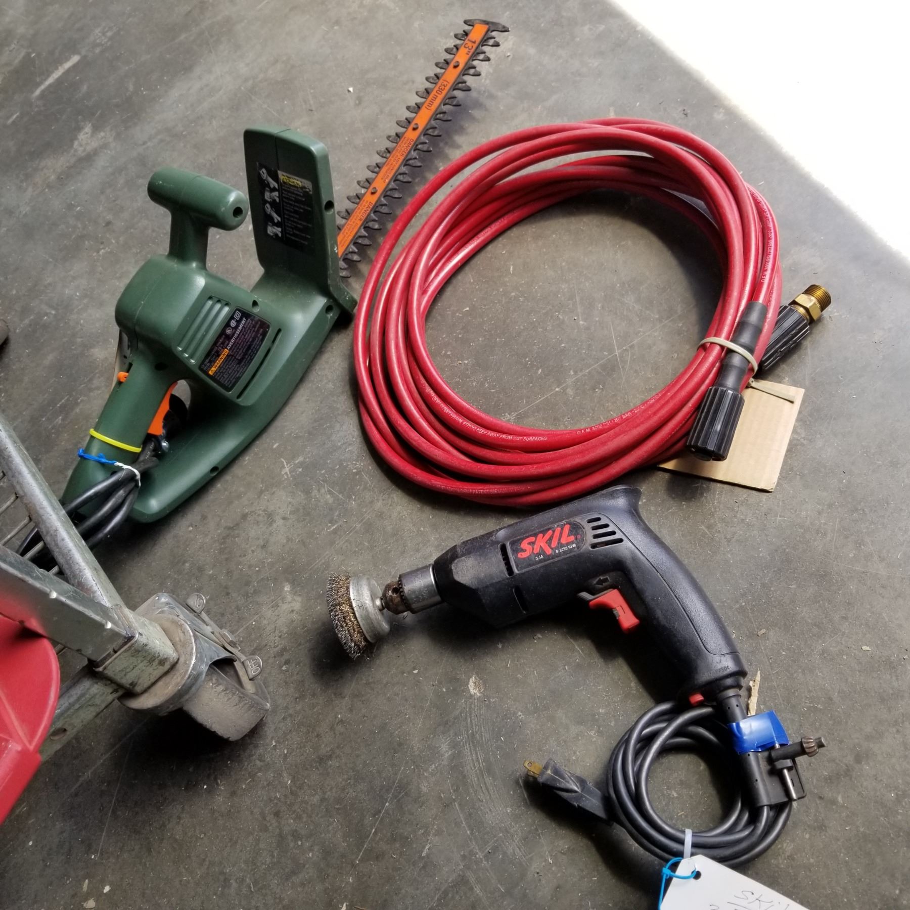SKILL SAW, HEDGE TRIMMER, AND AIR HOSE - ALL WORKING