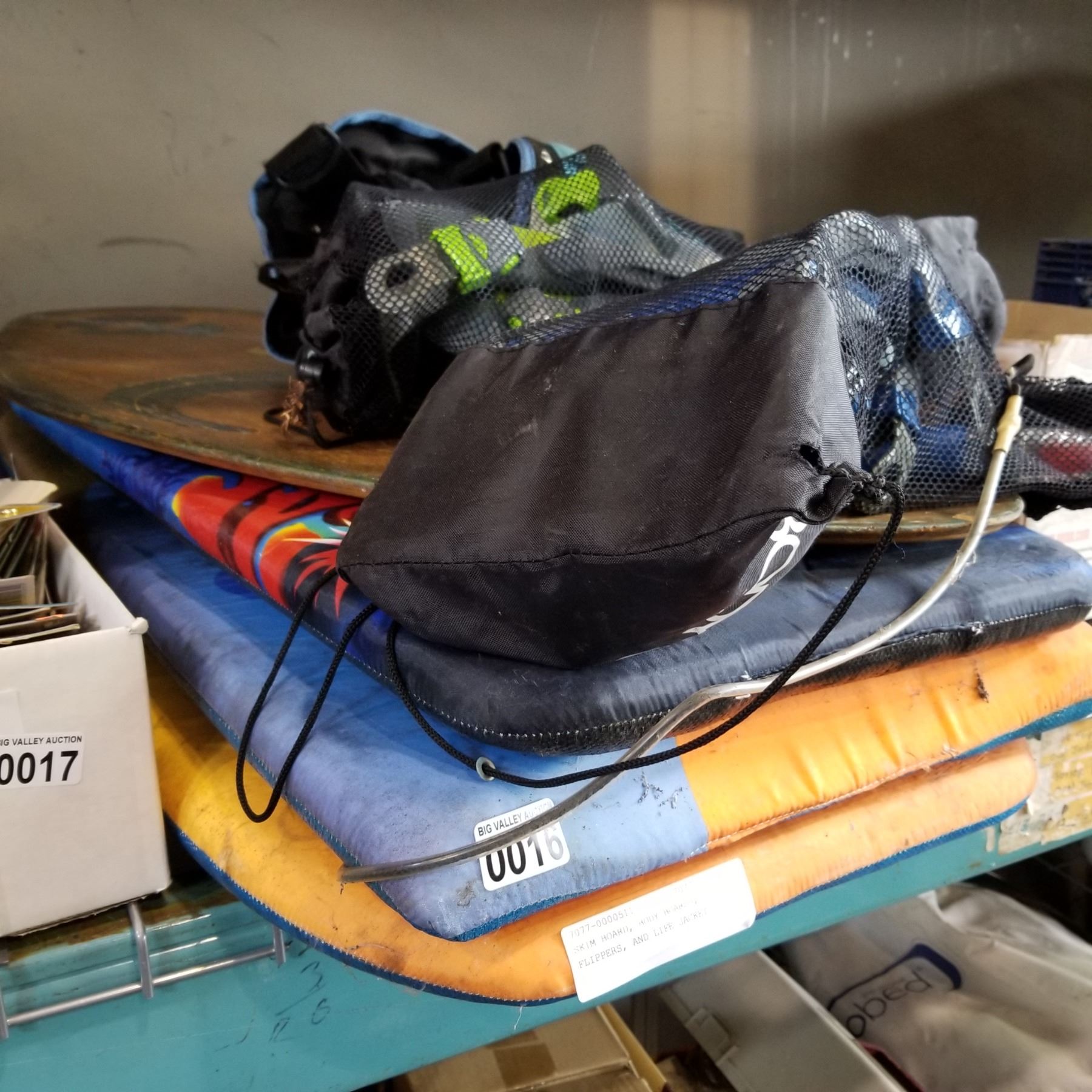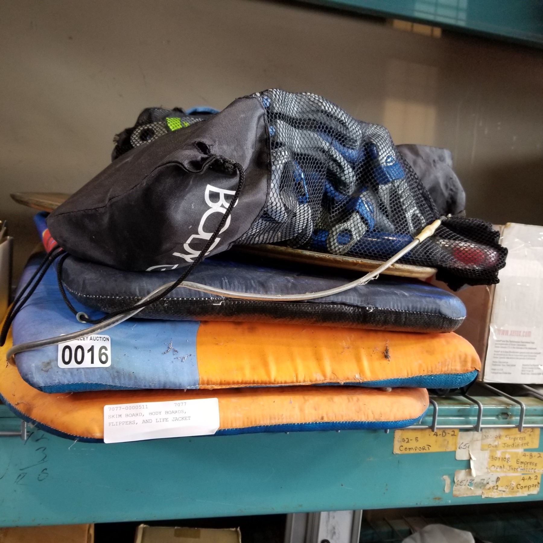 SKIM BOARD, BODY BOARDS, FLIPPERS, AND LIFE JACKET