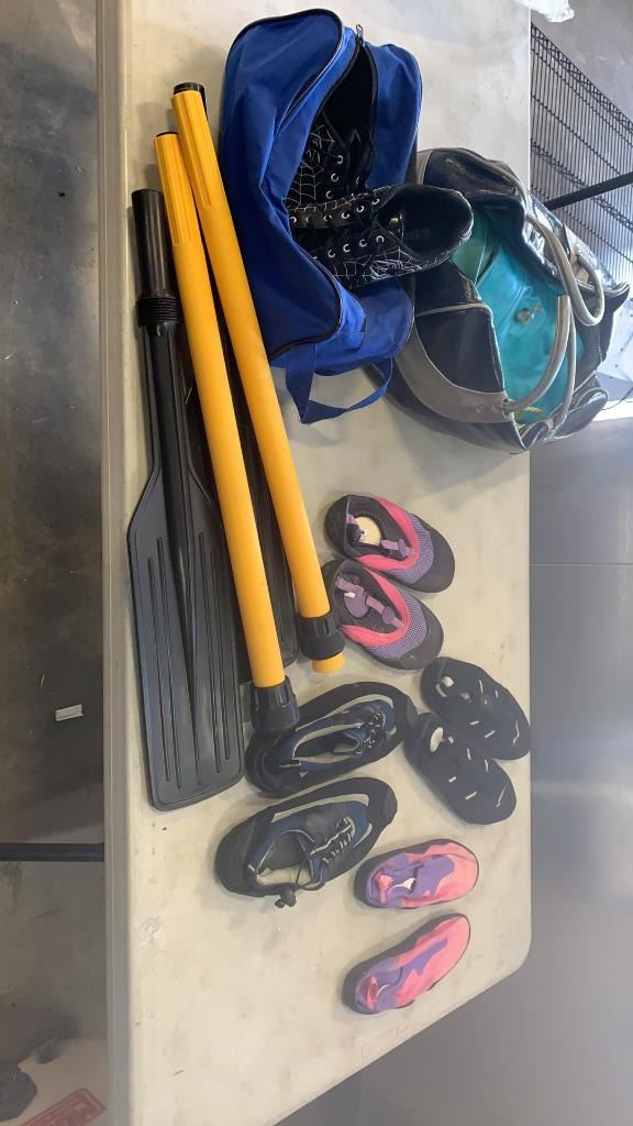 SMALL BLOW UP RAFT, WITH TAKE APART OARS, AND BOWLING SHOES, BOWLING BAG ETC