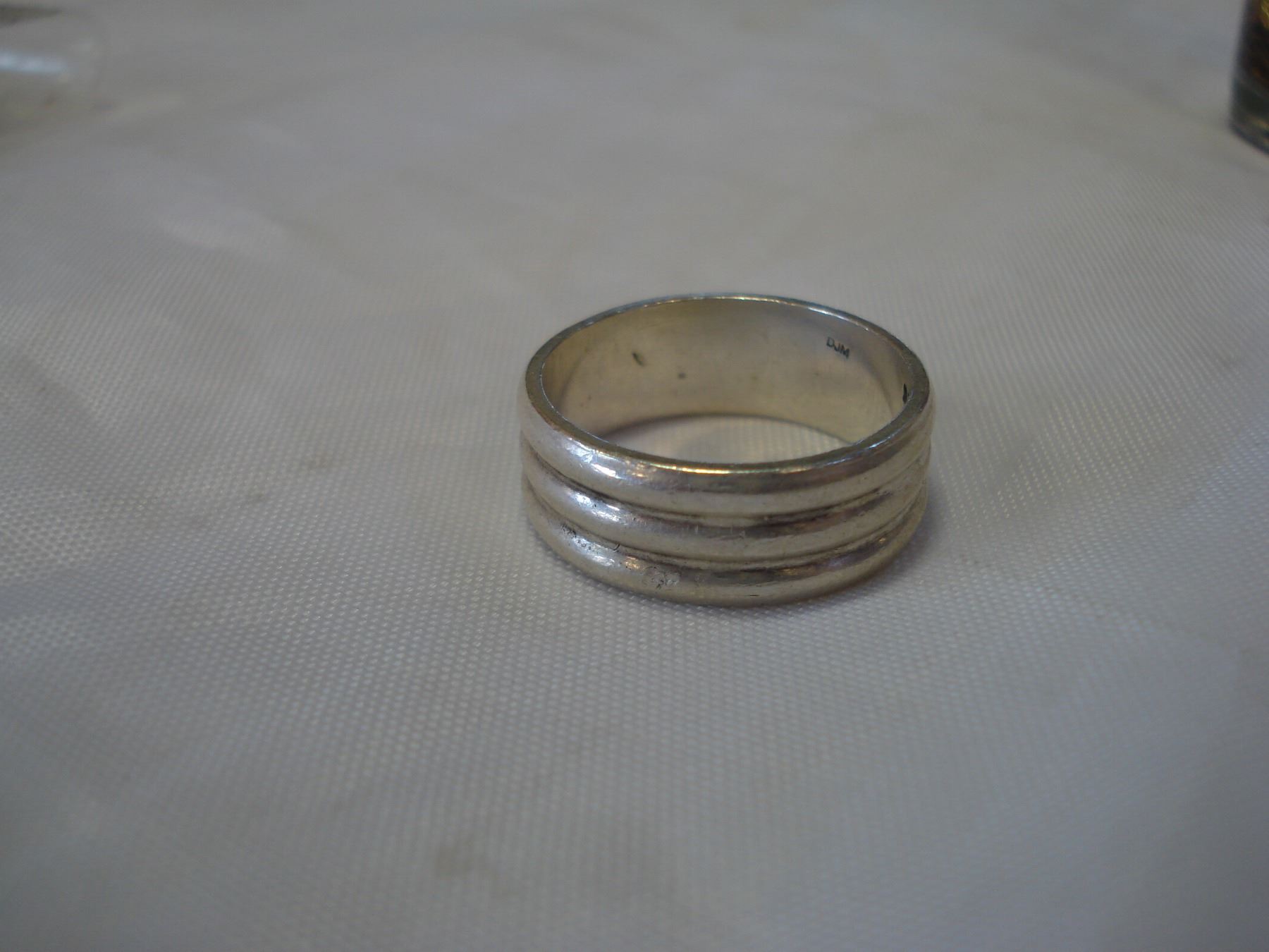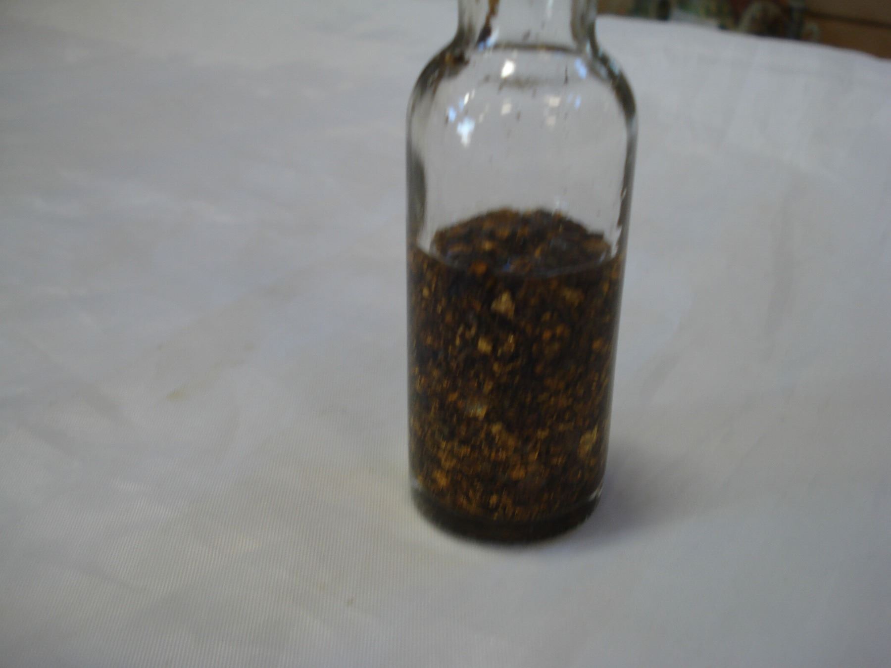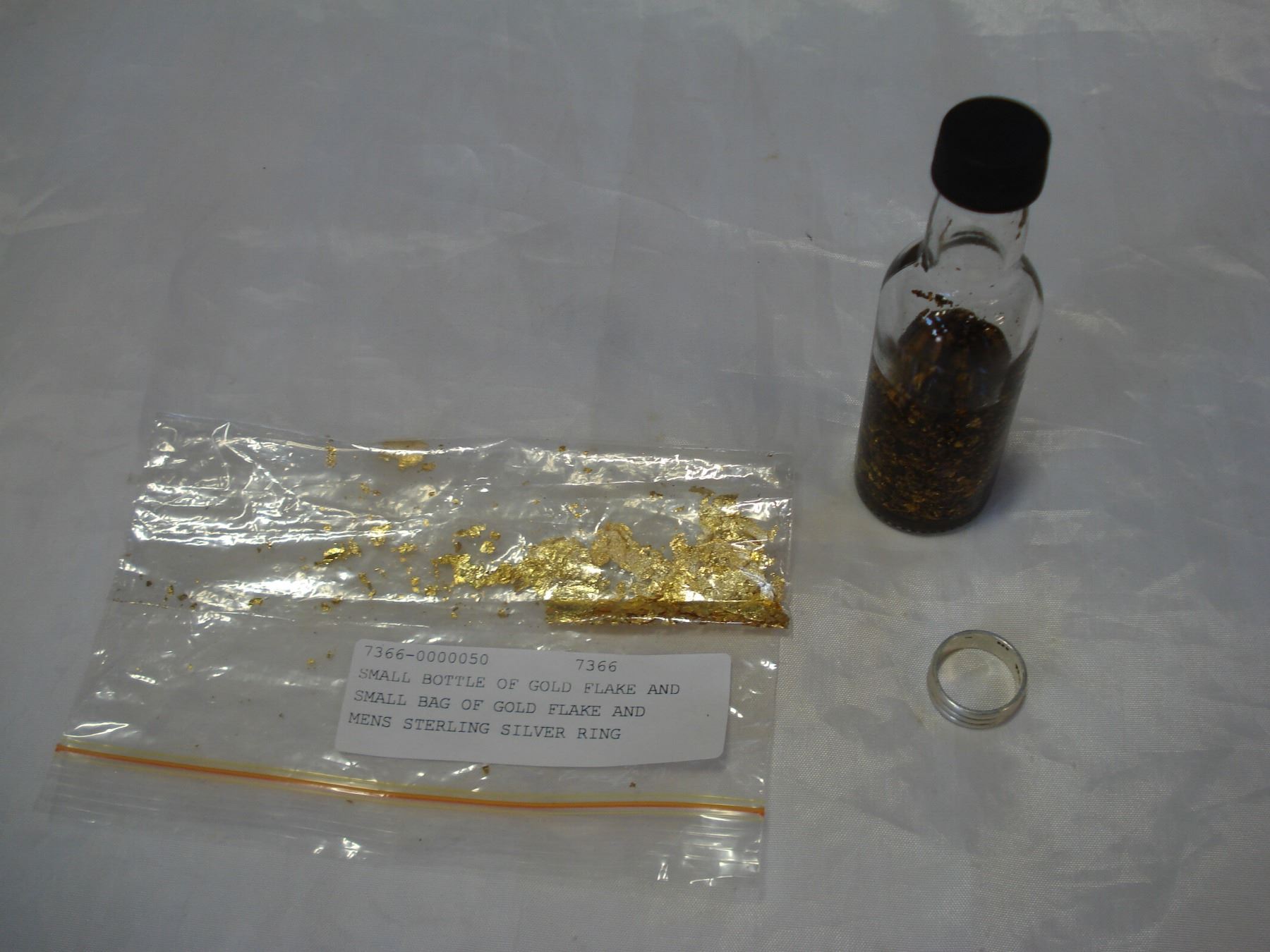SMALL BOTTLE OF GOLD FLAKE AND SMALL BAG OF GOLD FLAKE AND MENS STERLING SILVER RING