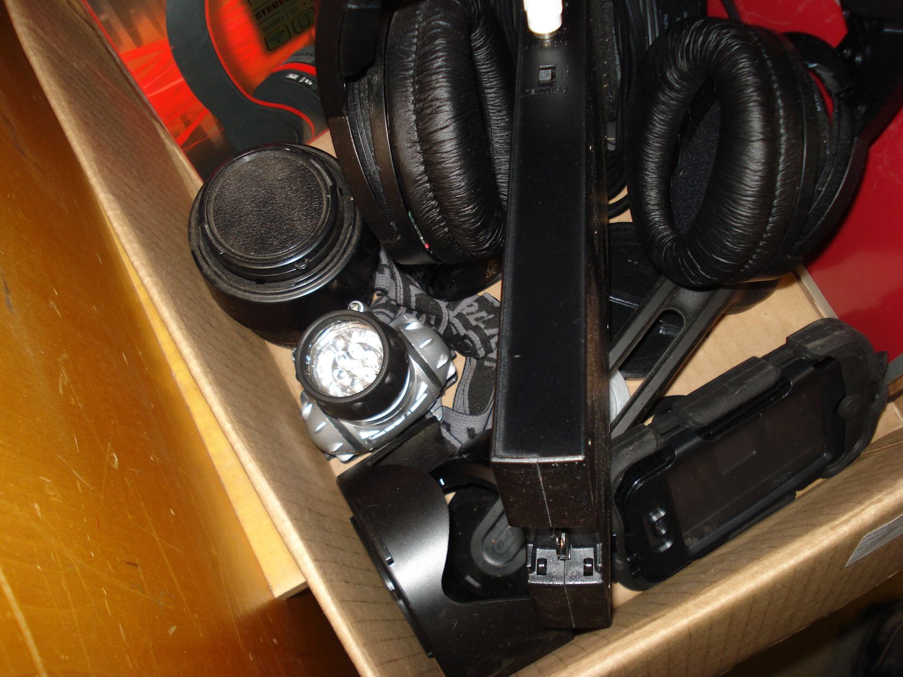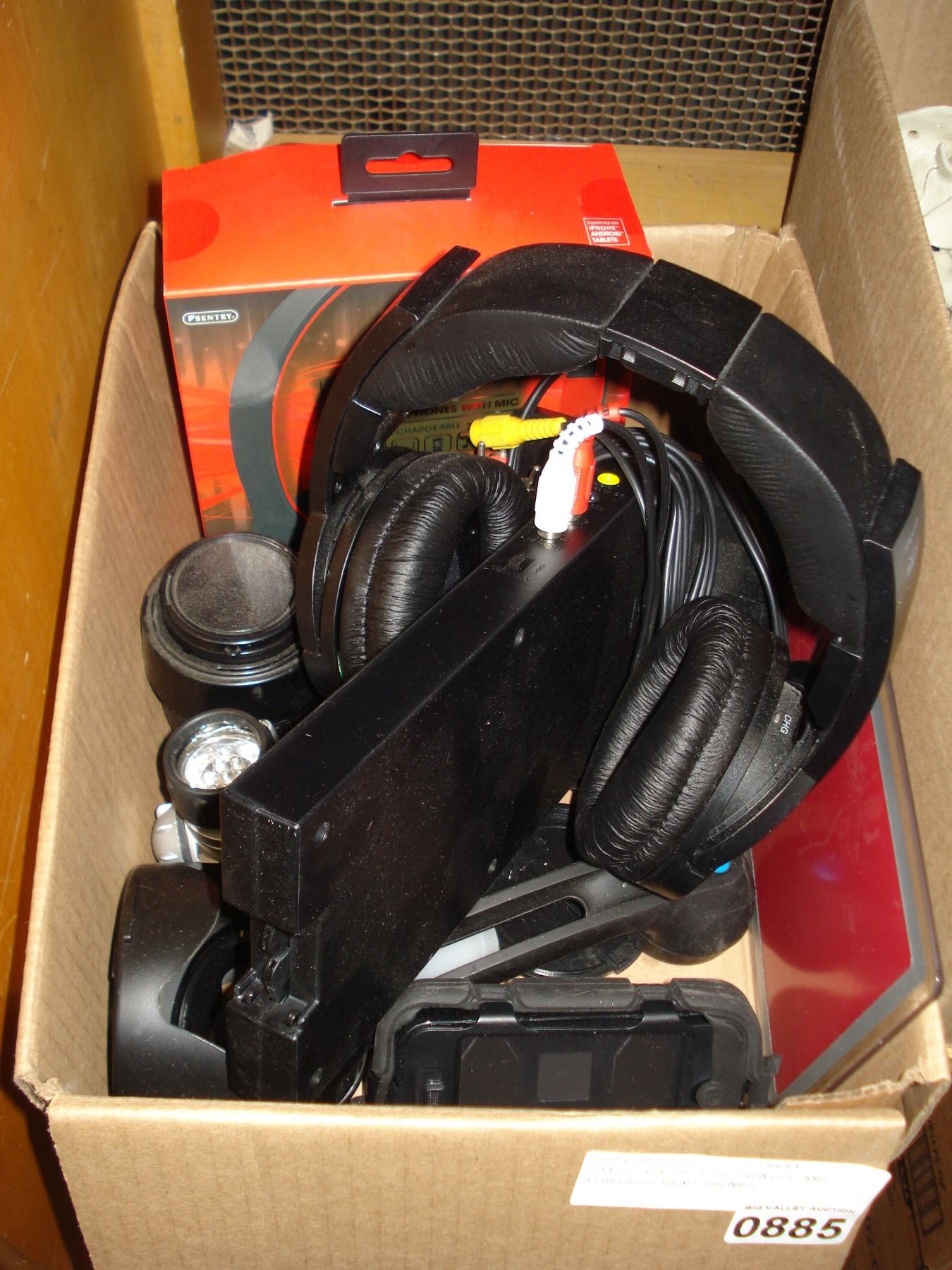 SMALL BOX OF ELECTRONICS AND WIRELESS HEAD PHONES