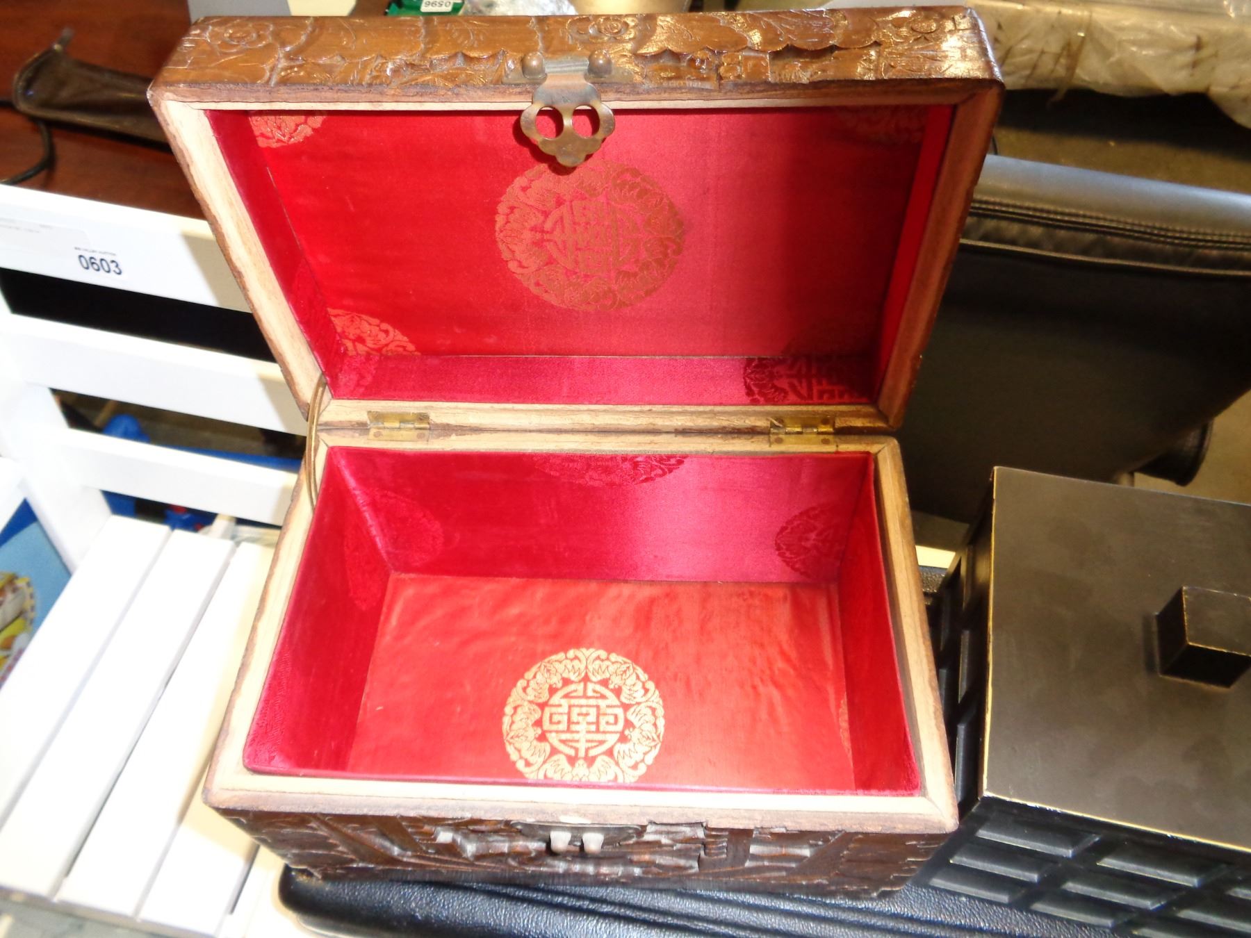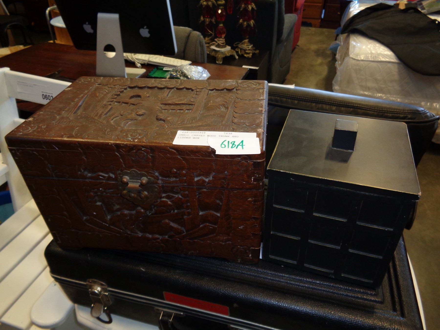 SMALL CARVED WOOD TRUNK AND LIDDED BOX