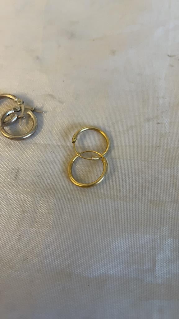 SMALL JEWLERY LOT - 2 PAIRS HOOP EARRINGS, 3 RINGS, AND STERLING SILVER NECKLACE WITH ENAMEL FISH PE