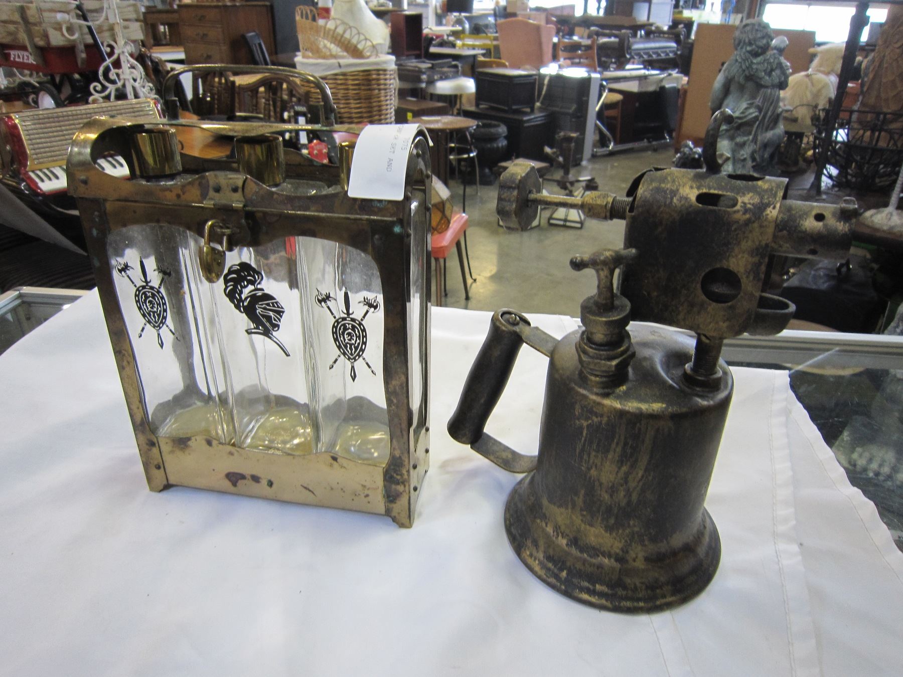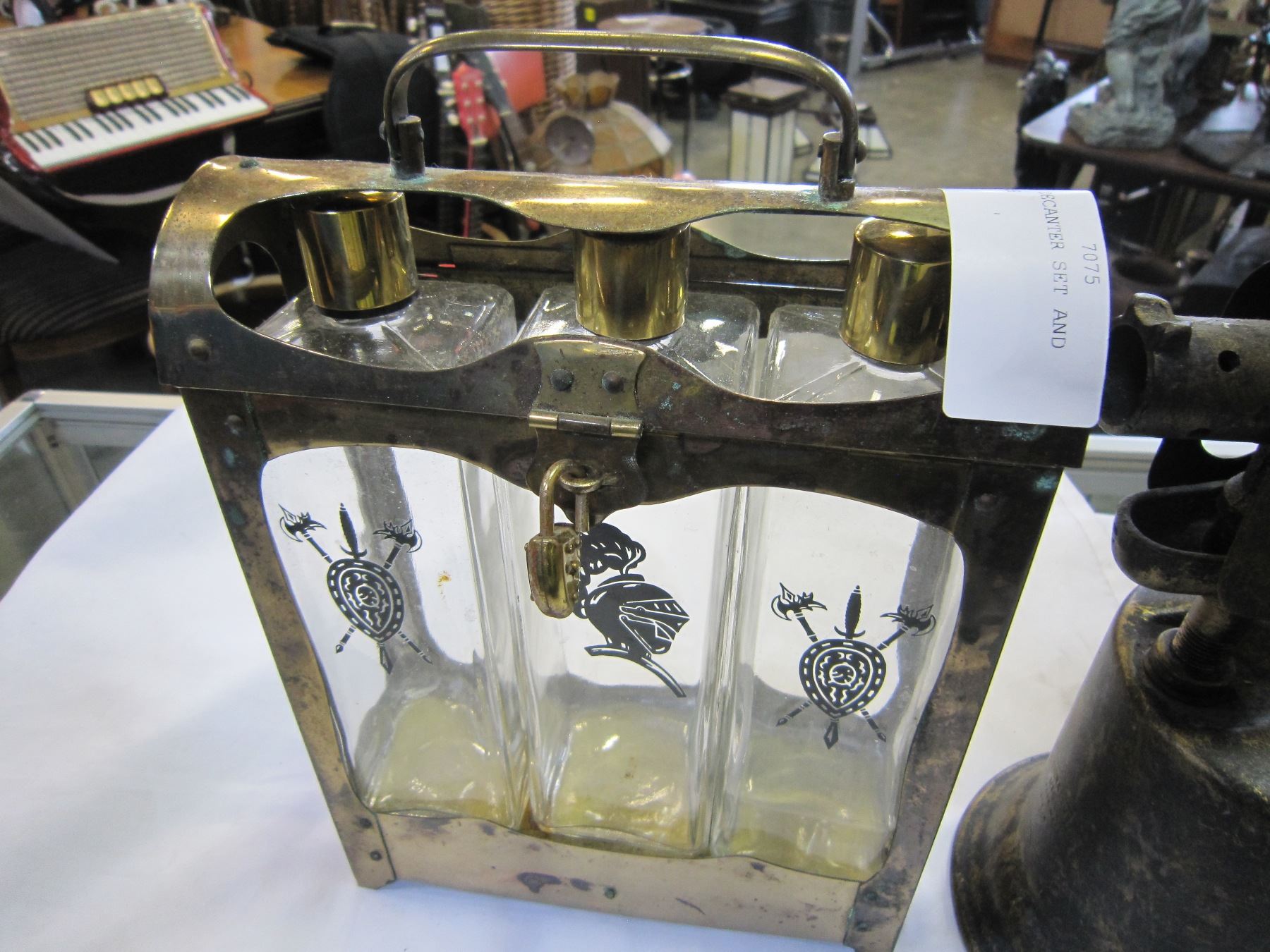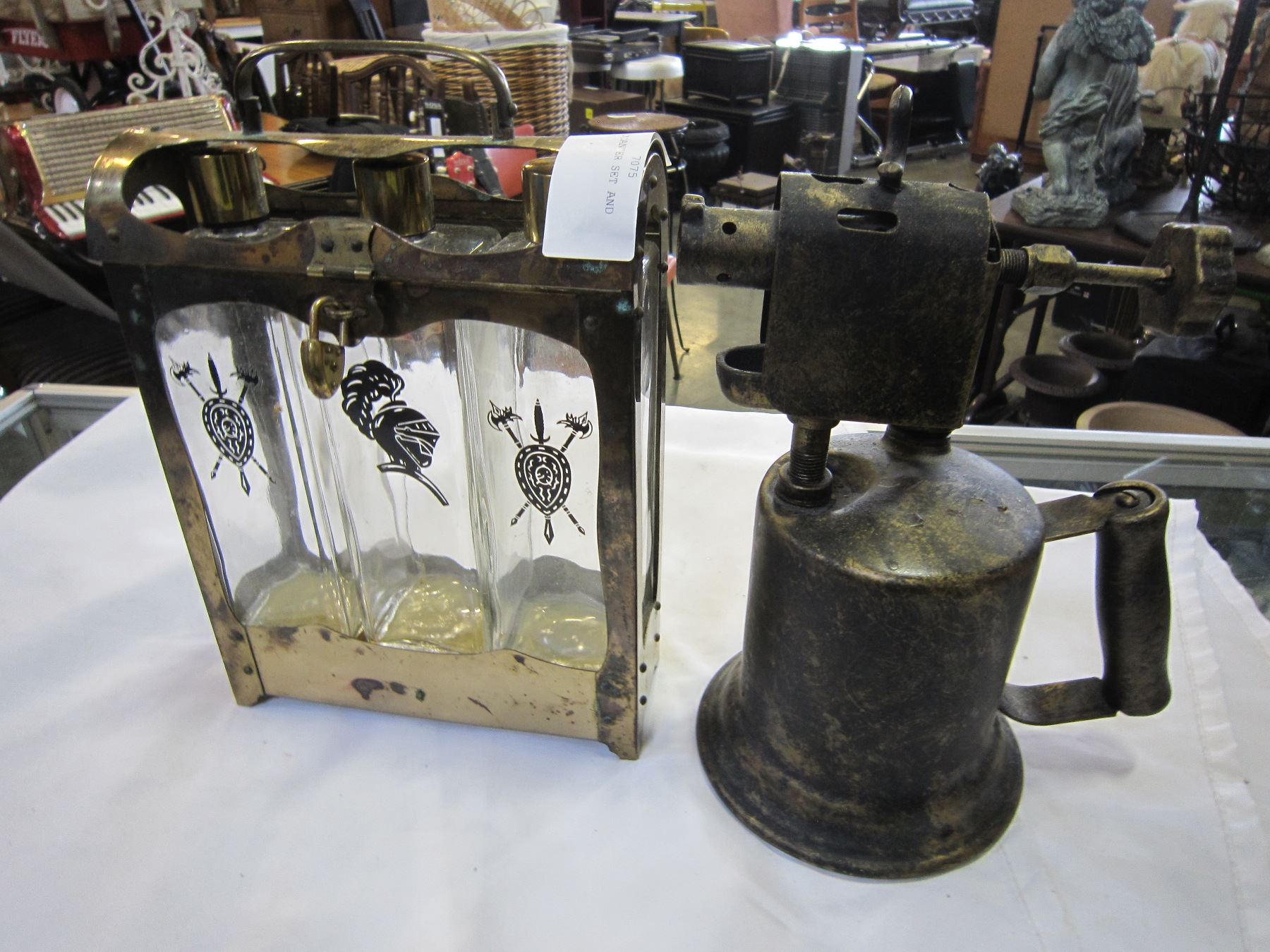 SMALL LIQUOR DECANTER SET AND ANTIQUE TORCH