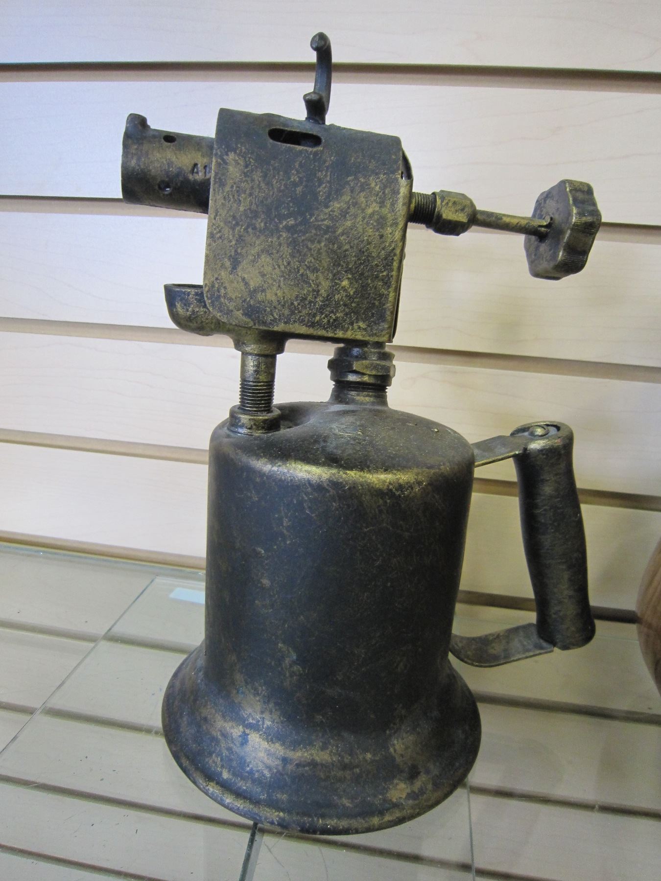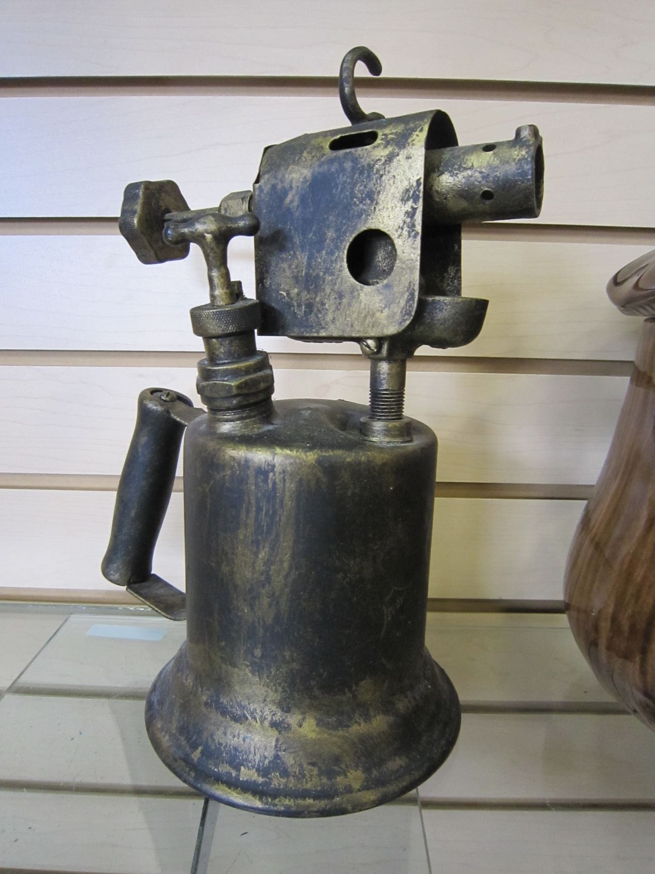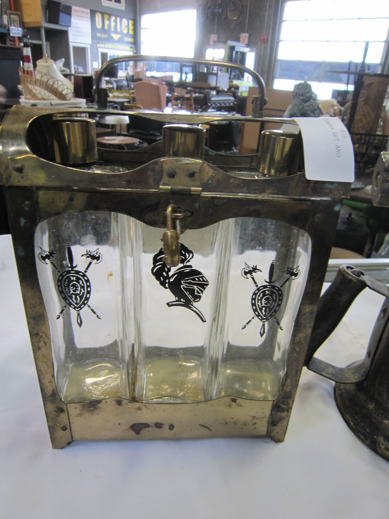 SMALL LIQUOR DECANTER SET AND ANTIQUE TORCH