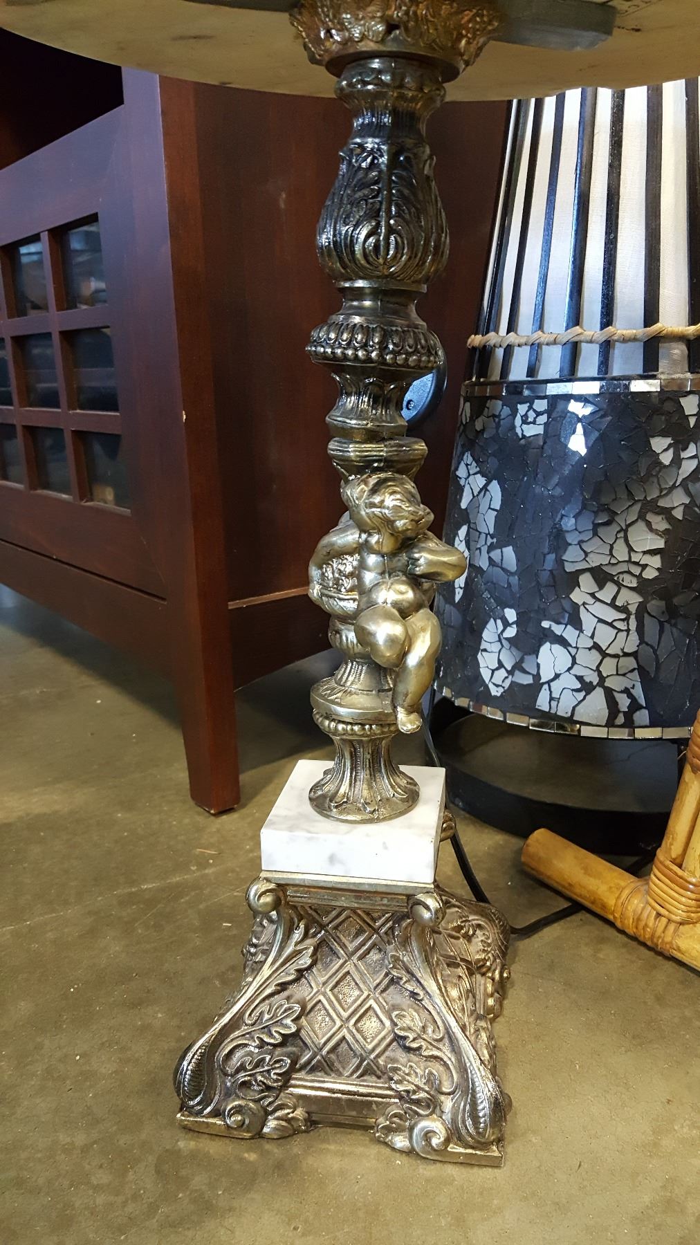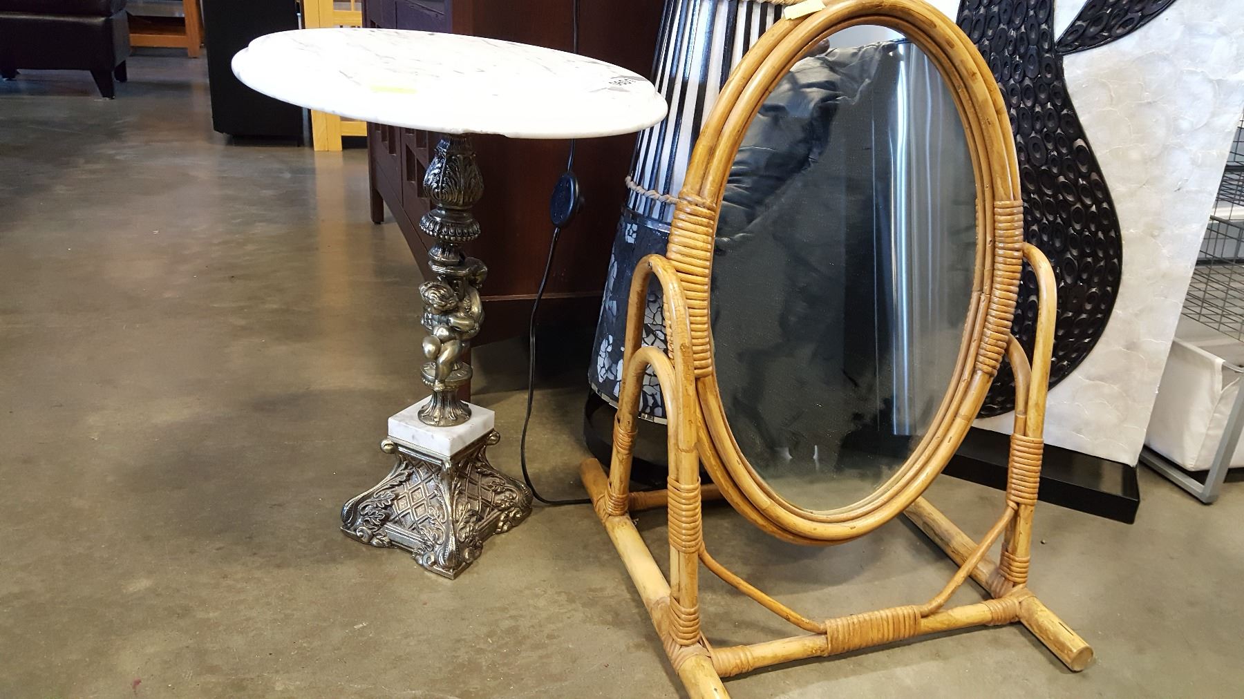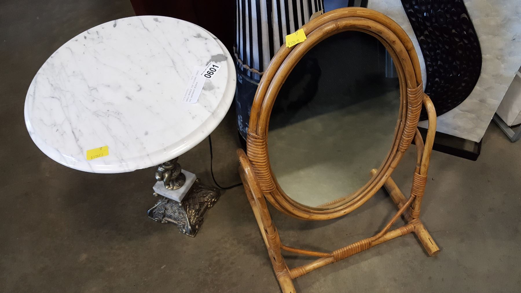 SMALL MARBLE TOP FIGURAL TABLE AND BENTWOOD MIRROR