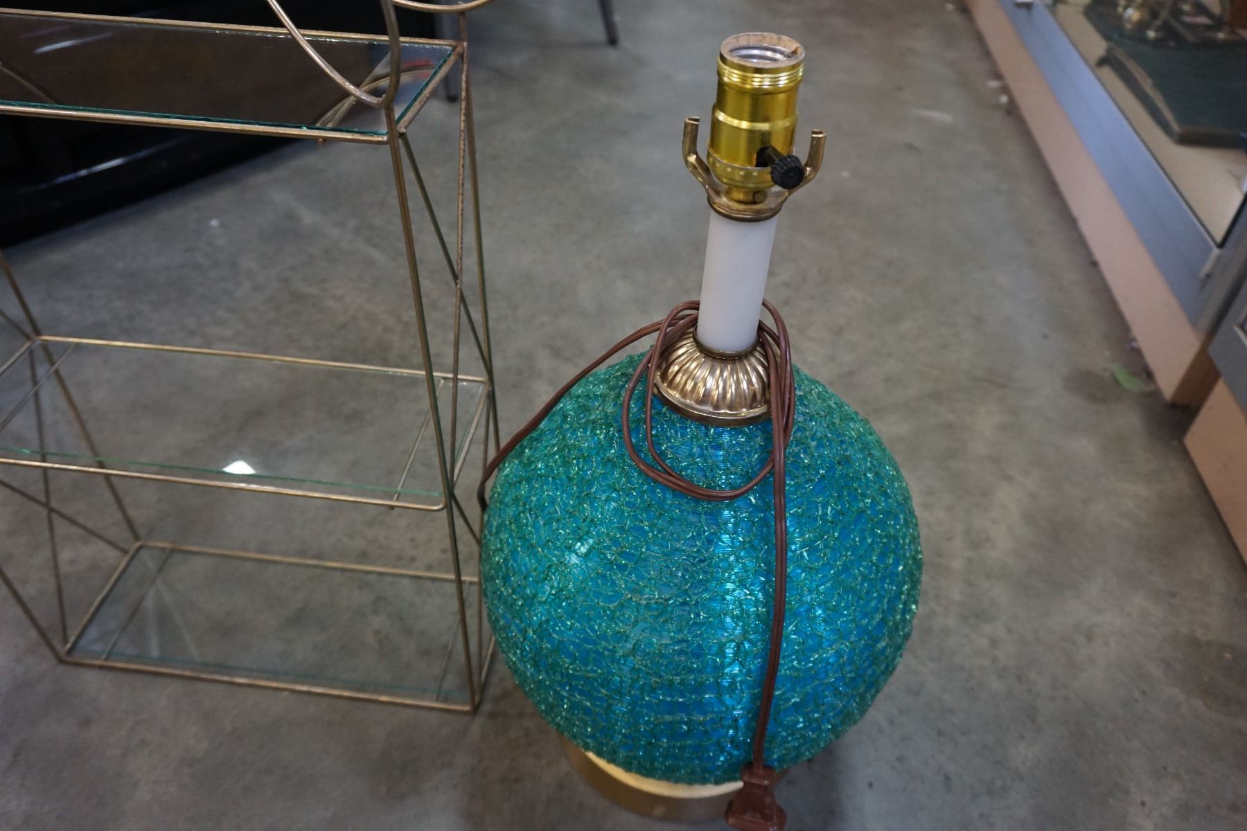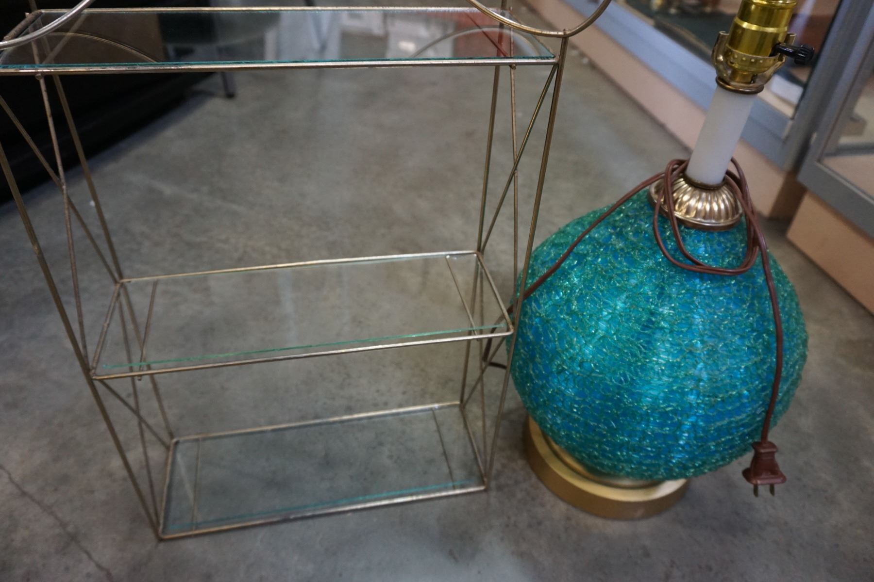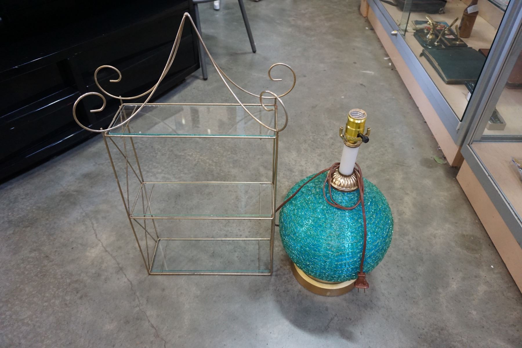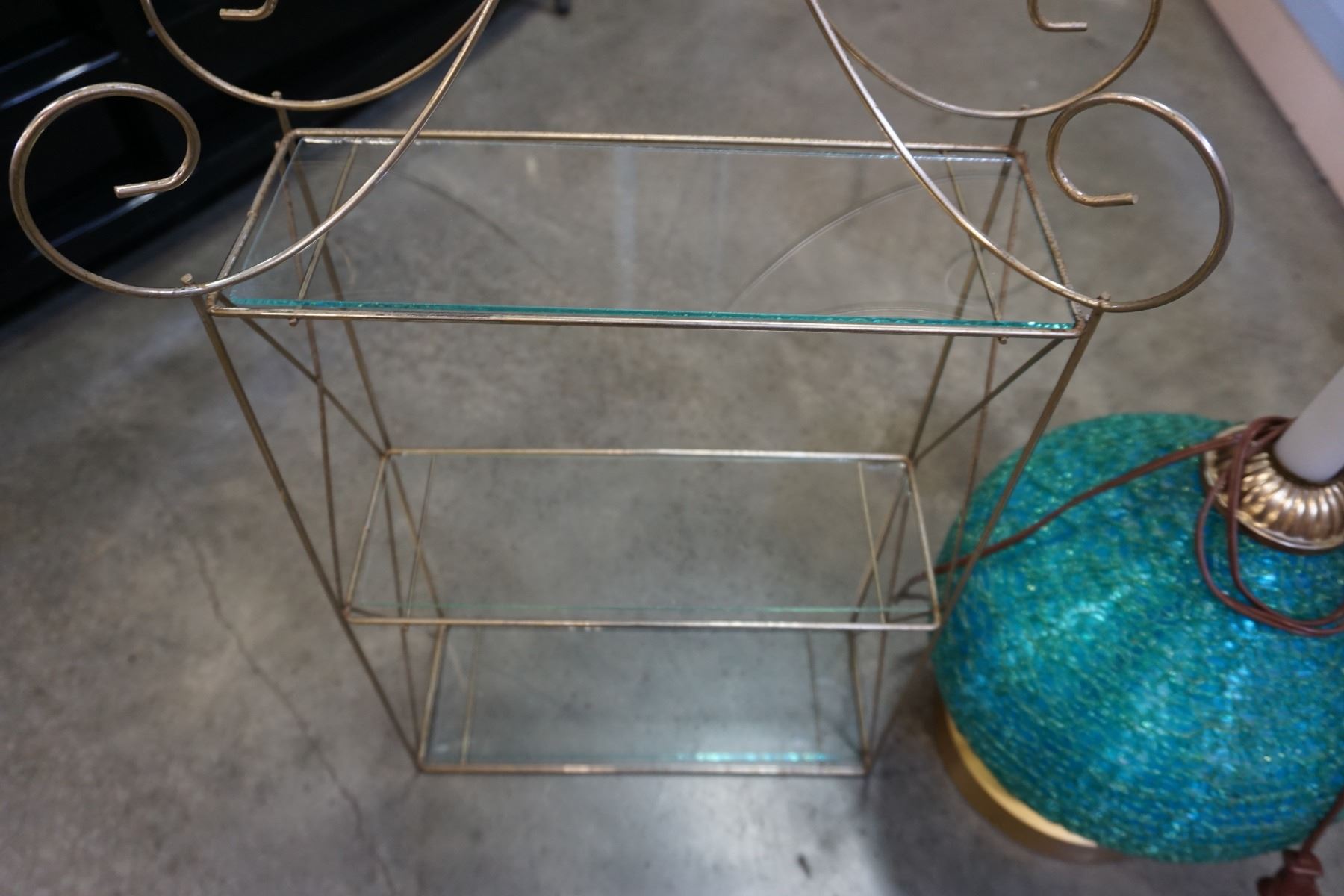 SMALL METAL STAND W/ GLASS SHELVES AND SPAGHETTI VINTAGE LAMP BASE