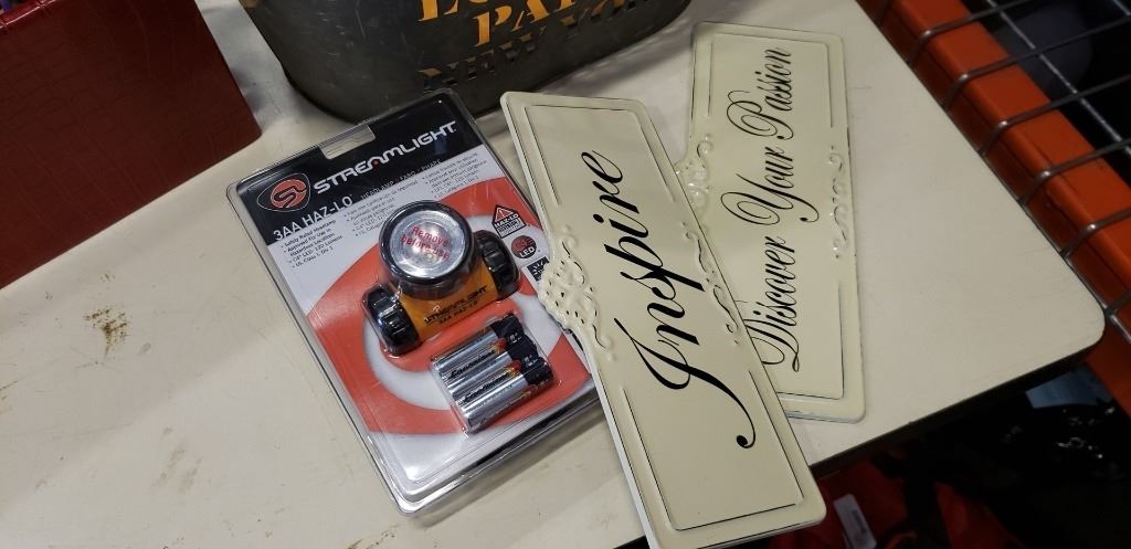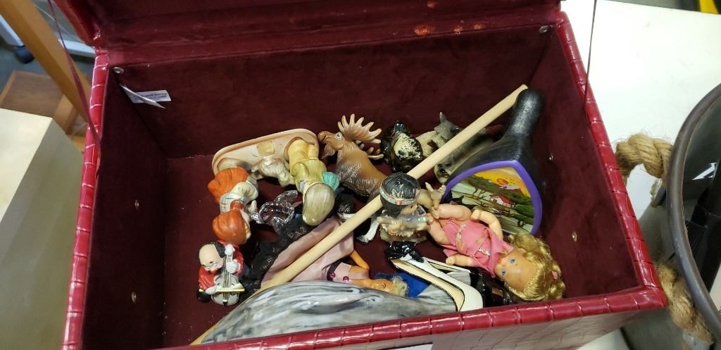 SMALL RED TRUNK OF FIGURES AND GALVANIZED PAIL OF HEAD LAMP , SIGNS, ETC