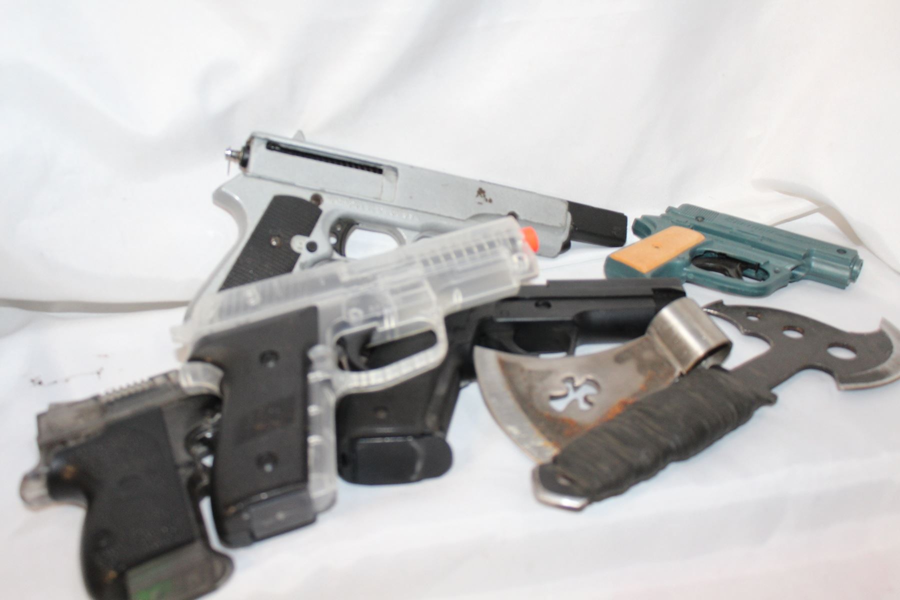 SMALL TOTE OF BB GUNS AND SMALL HATCHETS