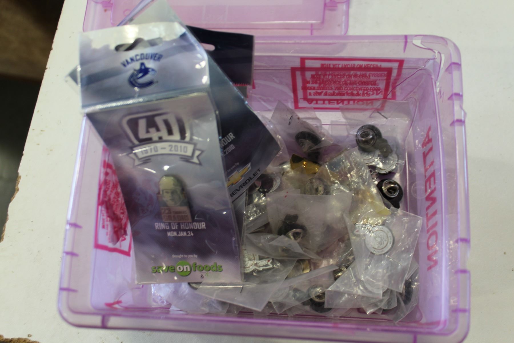 SMALL TOTE OF CANUCKS AND HOCKEY PINS