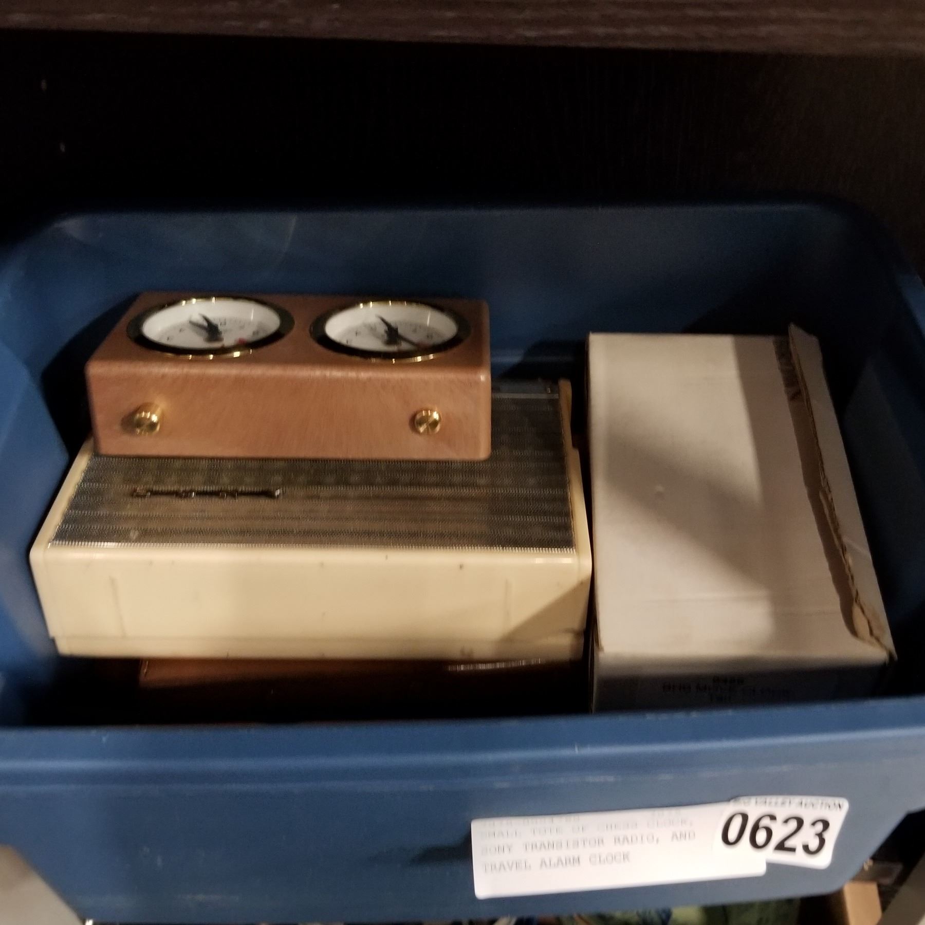 SMALL TOTE OF CHESS CLOCK, SONY TRANSISTOR RADIO, AND TRAVEL ALARM CLOCK