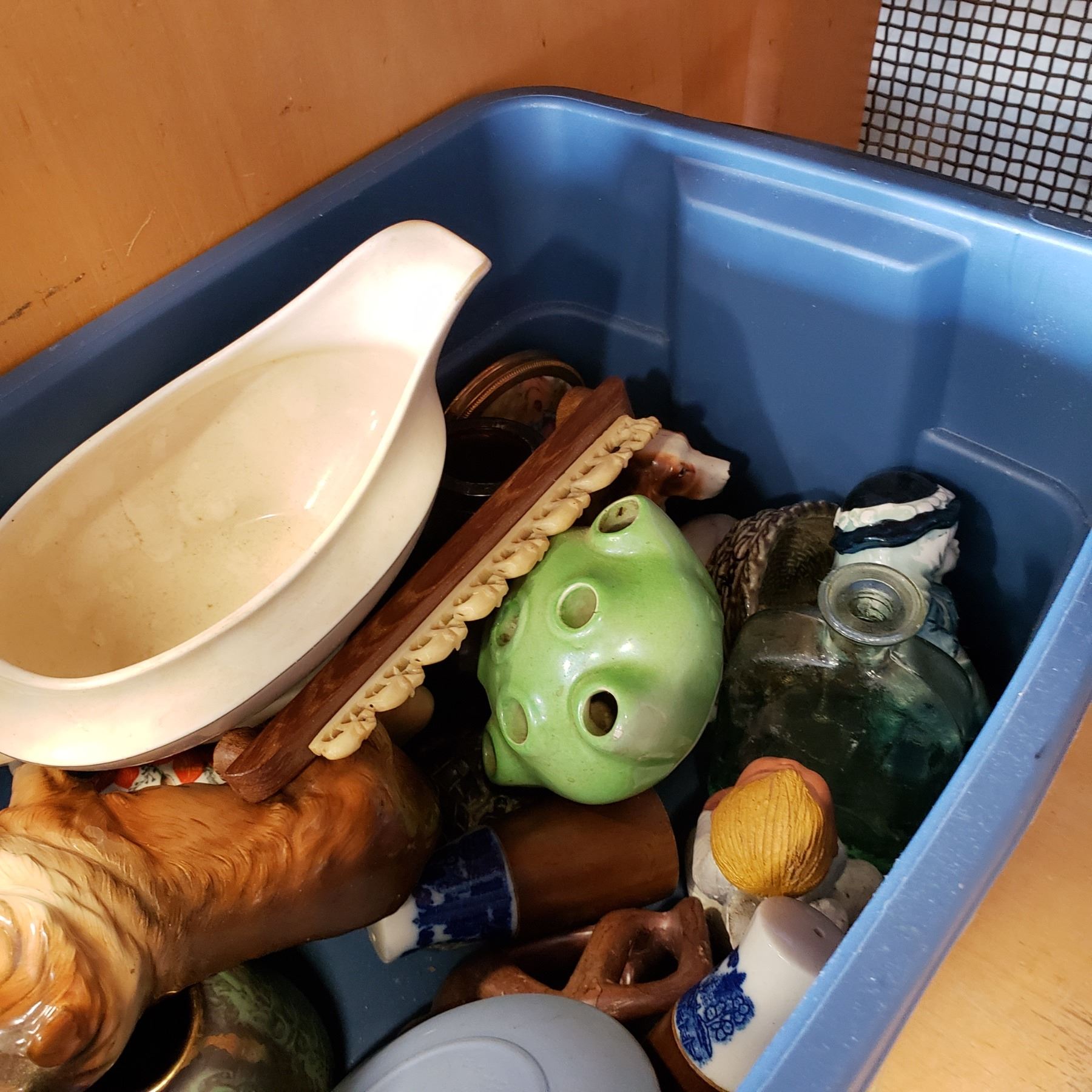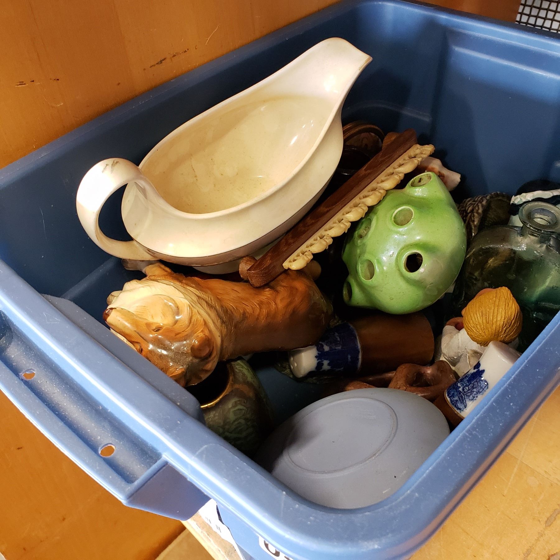 SMALL TOTE OF COLLECTIBLES, BESWICK, ROYAL DOULTON, WEDGEWOOD, ETC