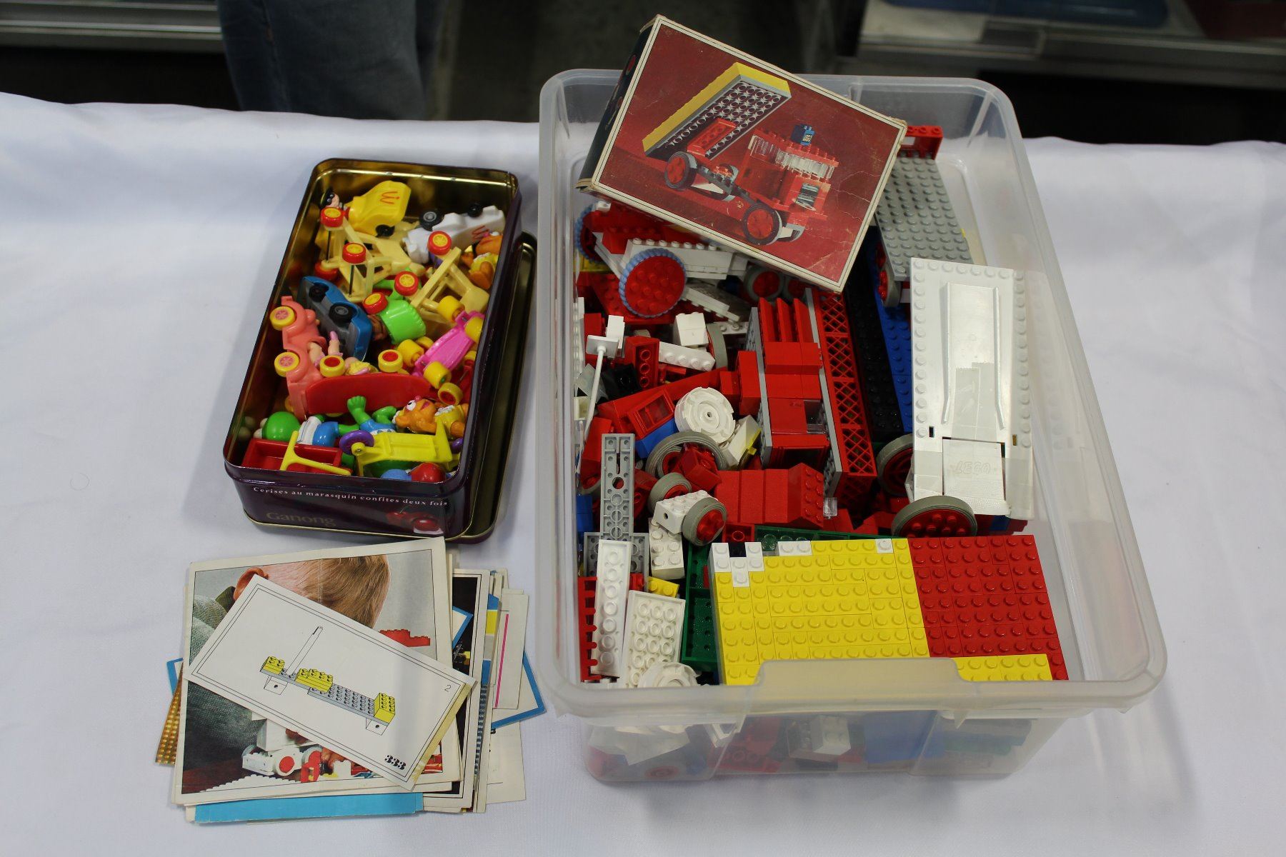 SMALL TOTE OF LEGO AND VINTAGE MCDONALDS TOYS