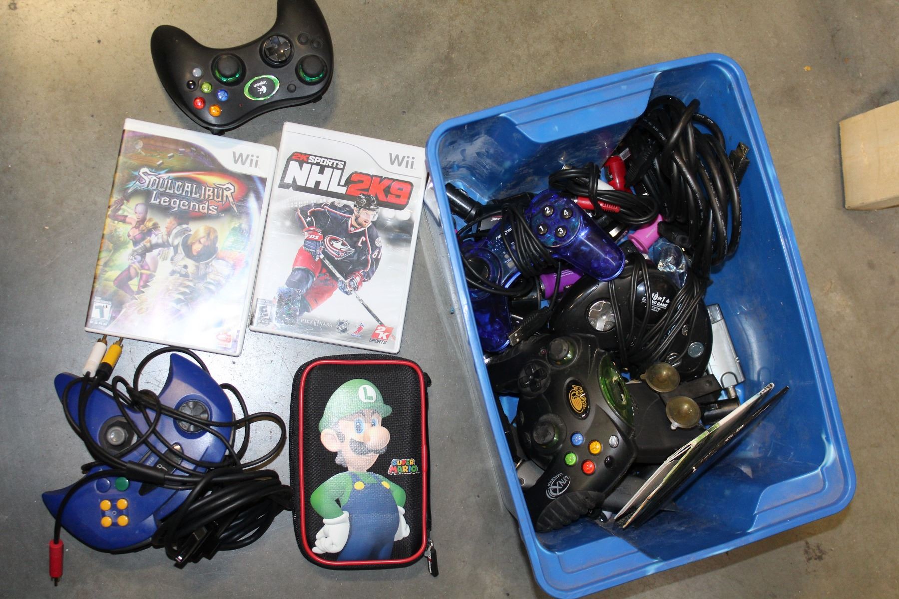 SMALL TOTE OF VIDEO GAME CONTROLLERS GAMES AND ELECTRONICS