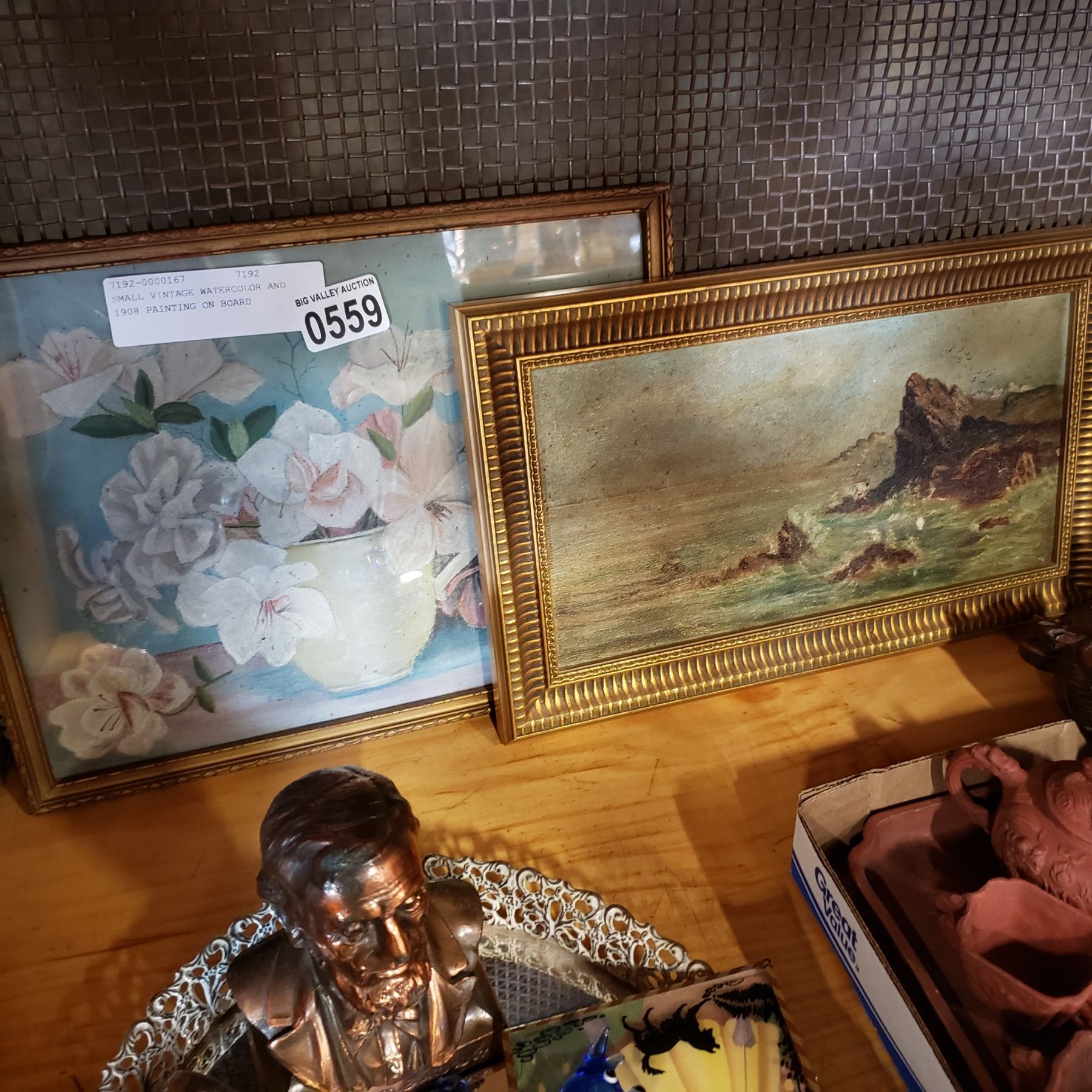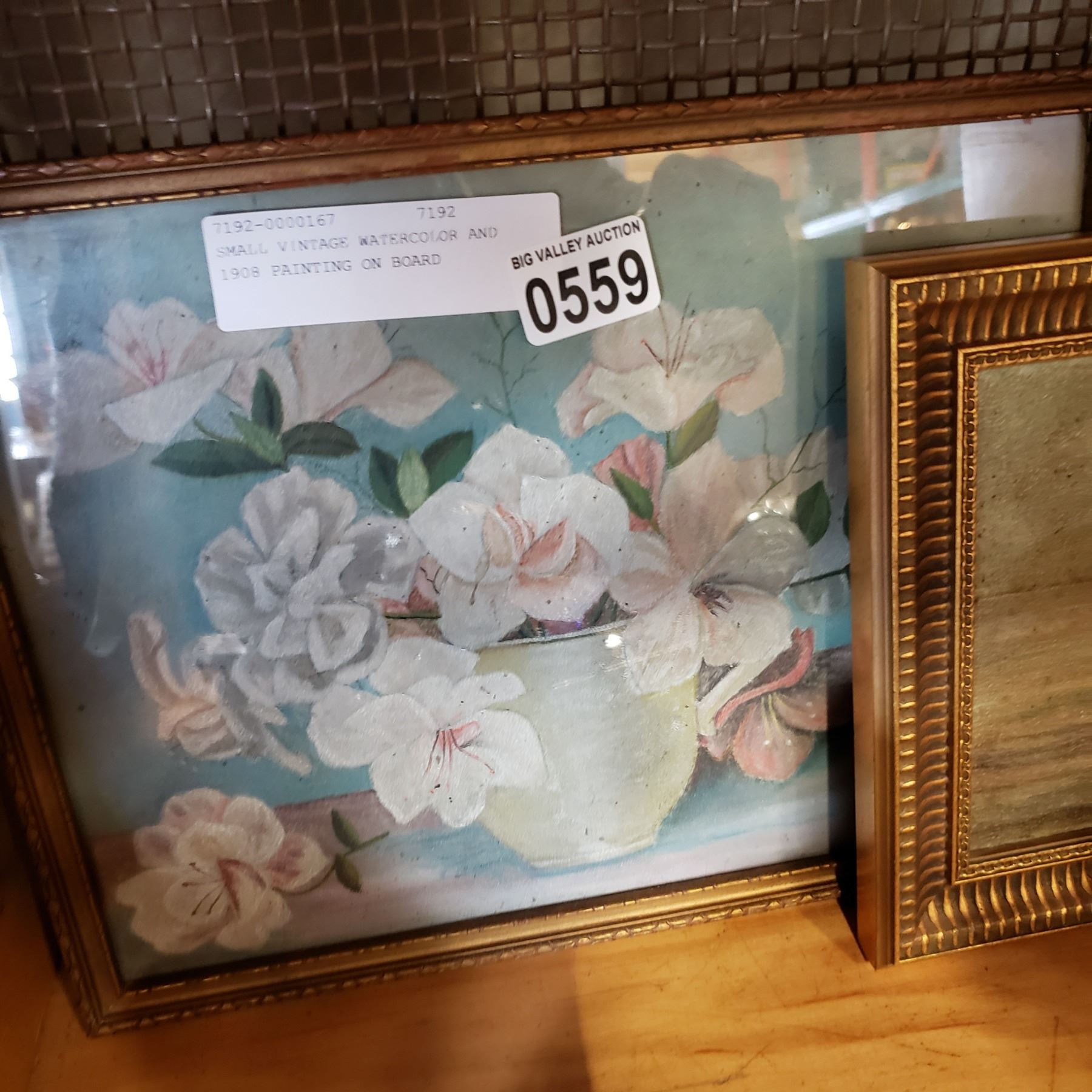 SMALL VINTAGE WATERCOLOR AND 1908 PAINTING ON BOARD