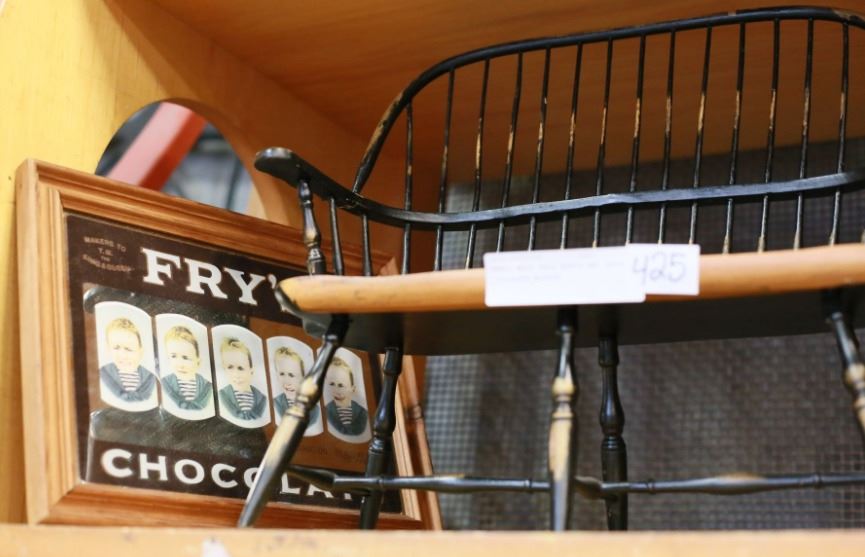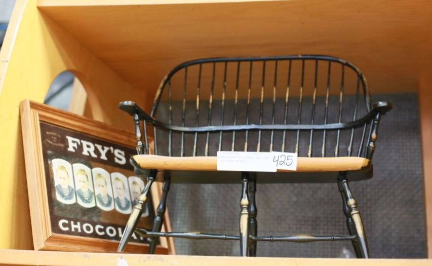 SMALL WOOD DOLL BENCH AND FRYS CHOCOLATE MIRROR