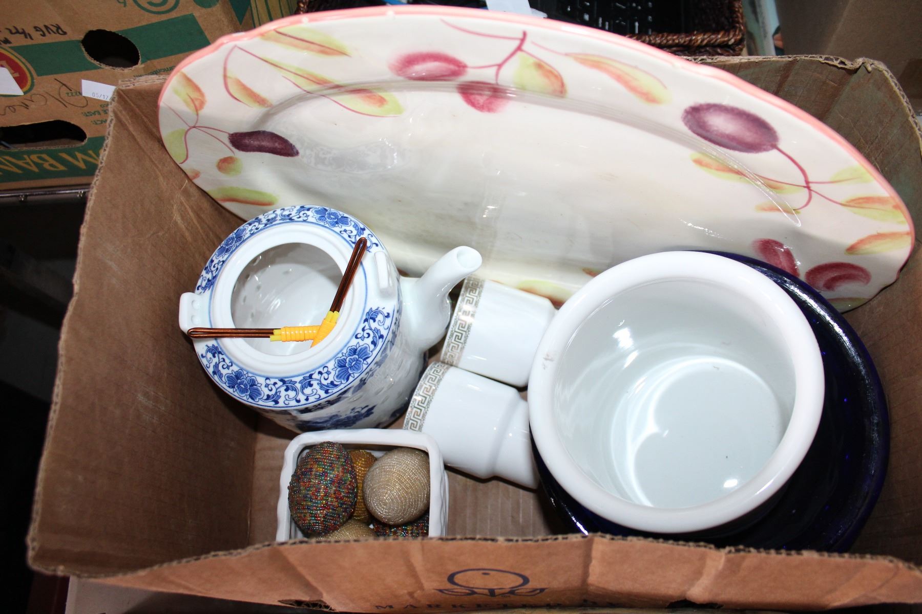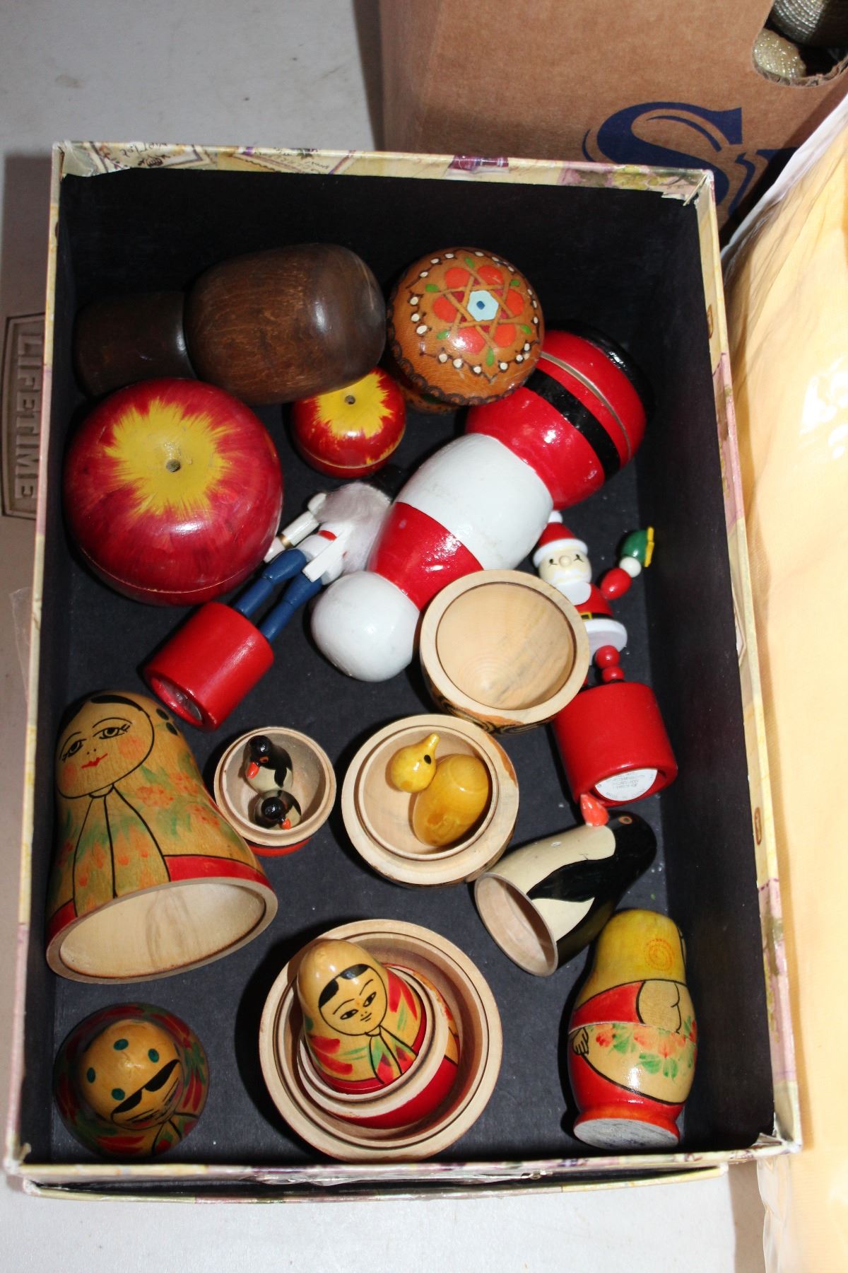 SMALL WOOD FIGURE JARS ANND 2 BOXES OF ESTATE GOODS