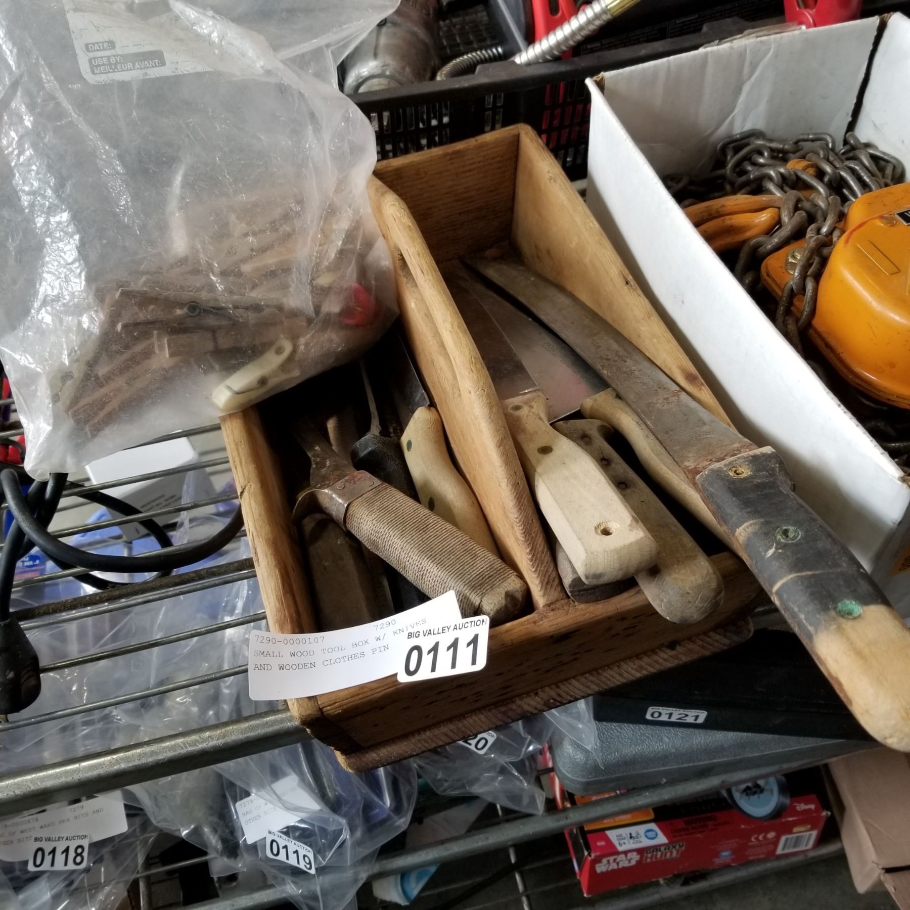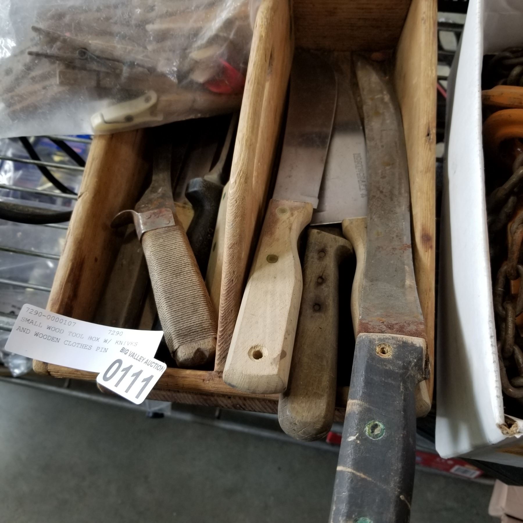 SMALL WOOD TOOL BOX W/ KNIVES AND WOODEN CLOTHES PIN