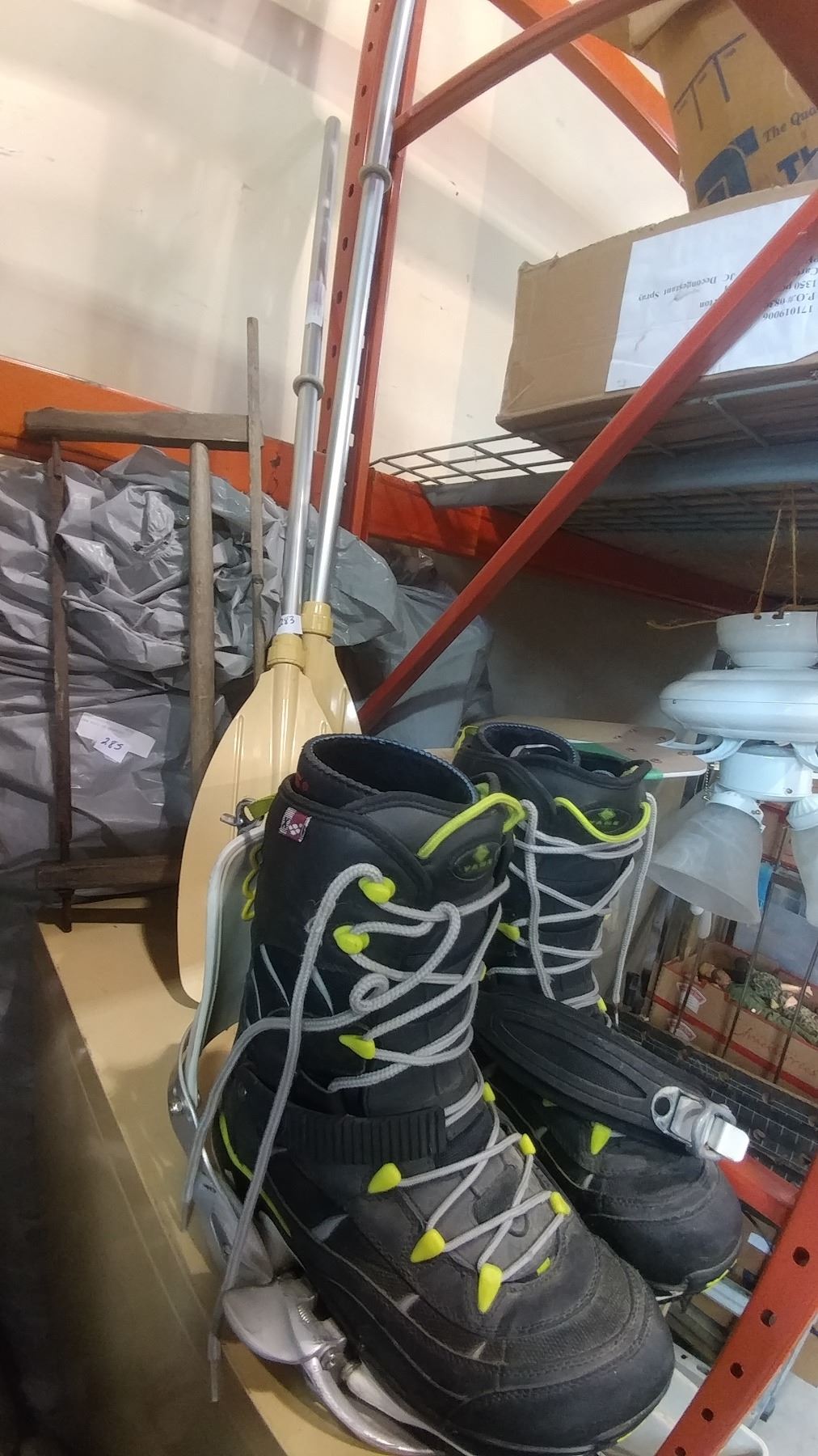 SNOWBOARD BOOTS AND BINDINGS ALUMINUM OARS AND VINTAGE SAW