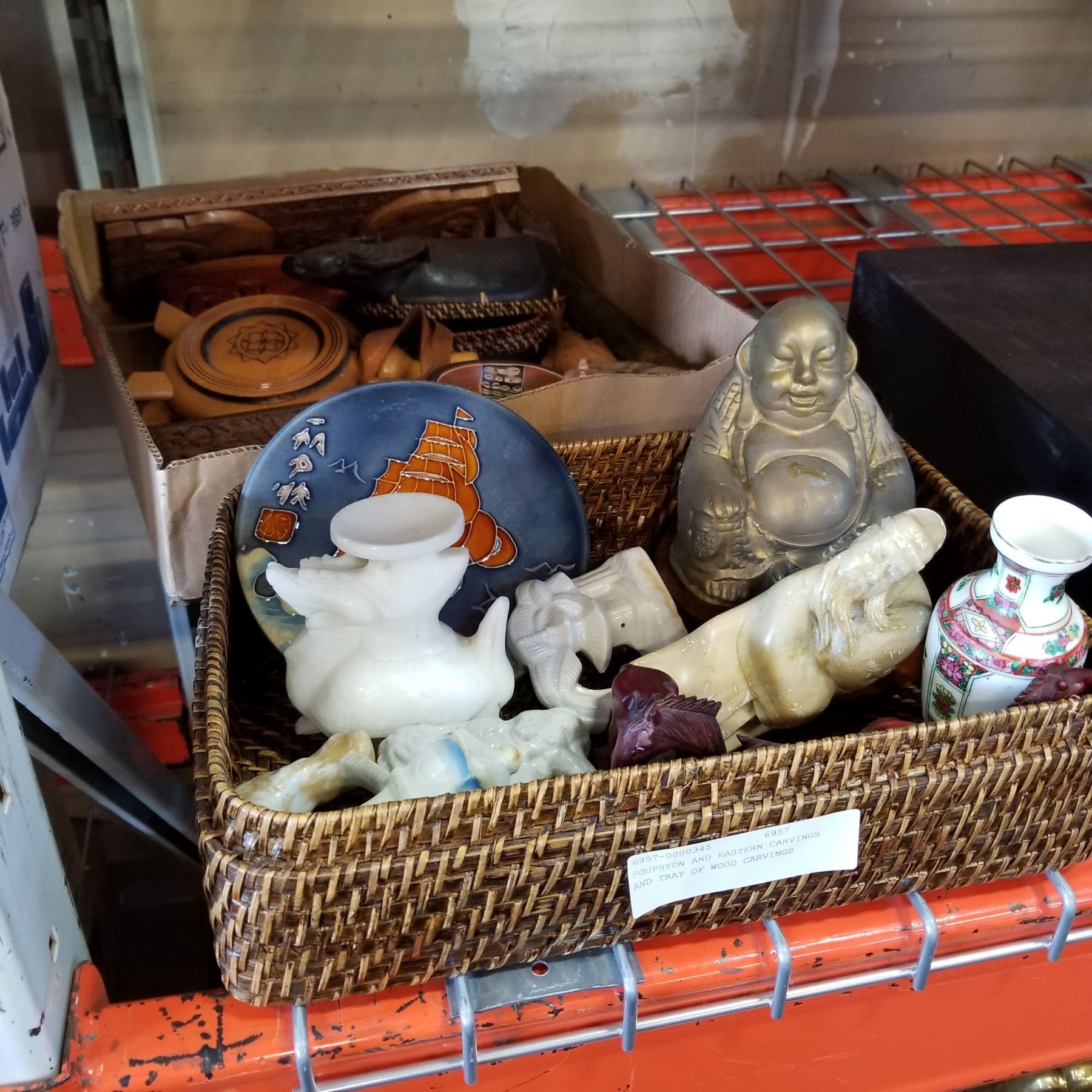 SOAPSTONE AND EASTERN CARVINGS AND TRAY OF WOOD CARVINGS