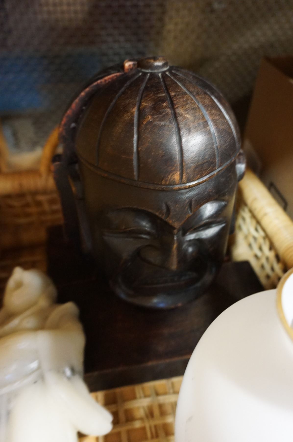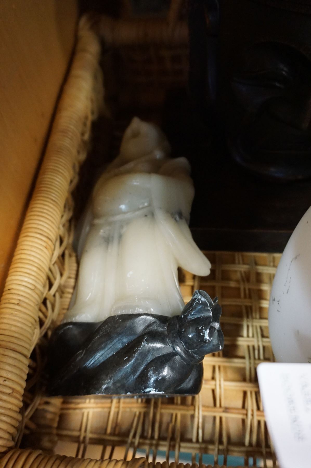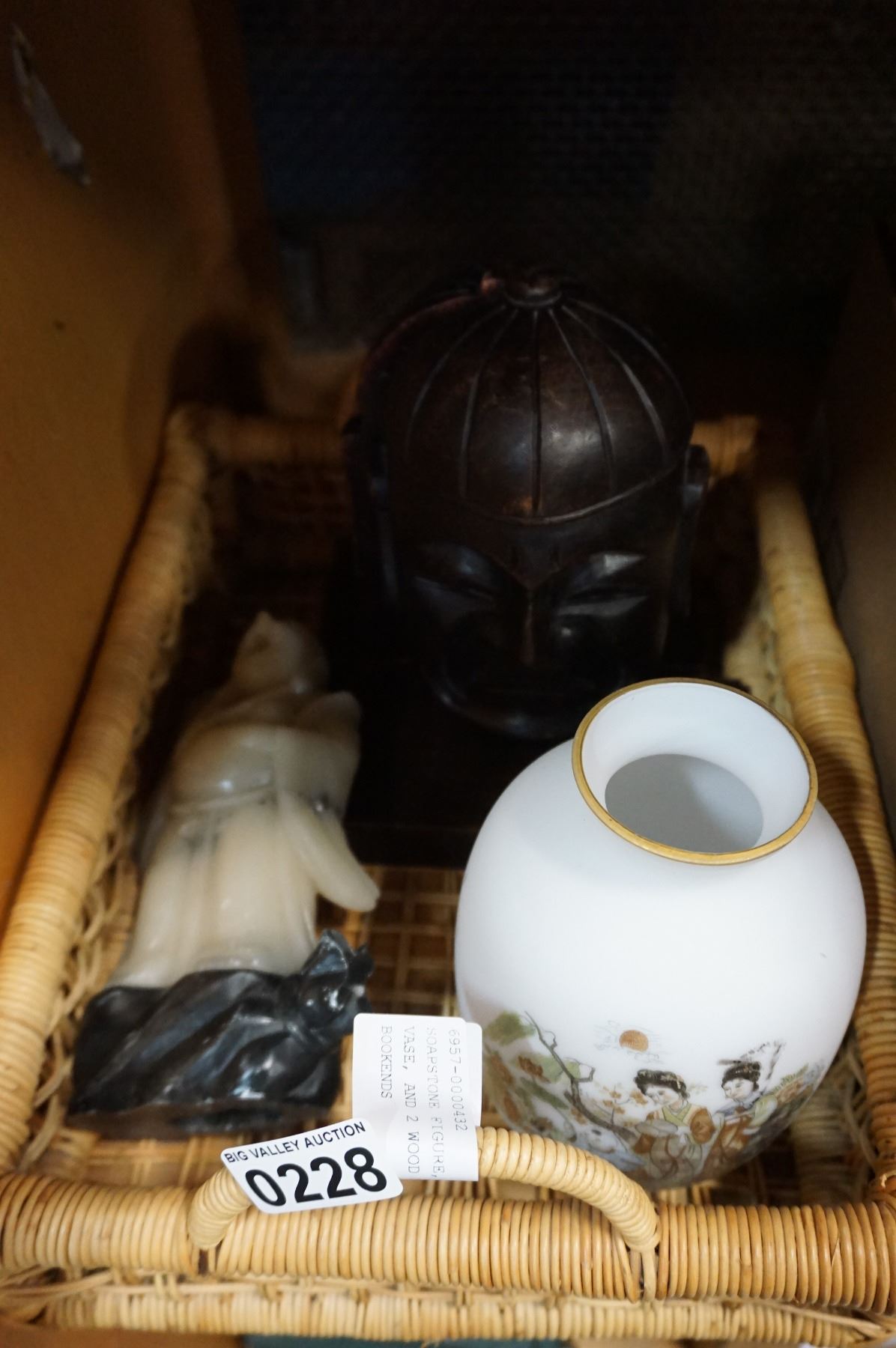 SOAPSTONE FIGURE, EASTERN VASE, AND 2 WOOD CARVED BOOKENDS
