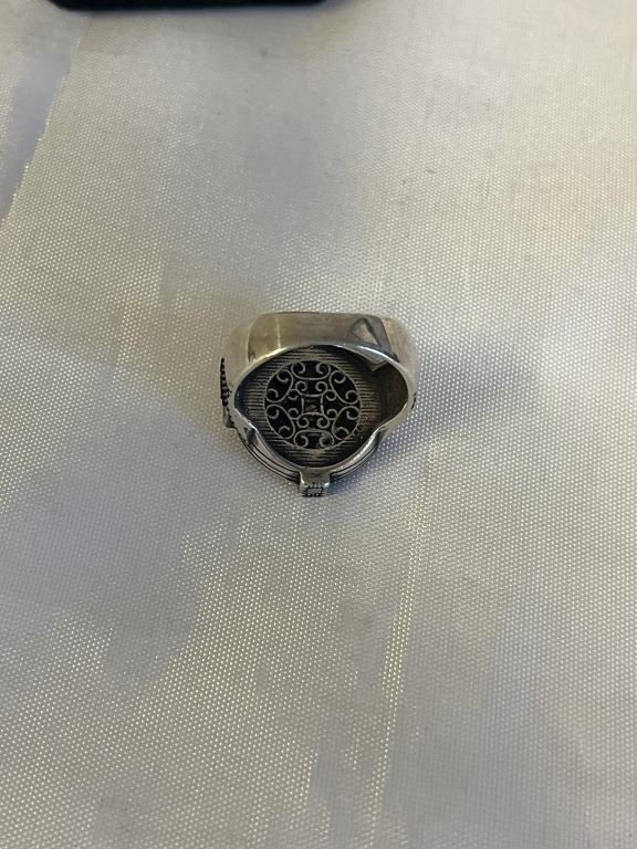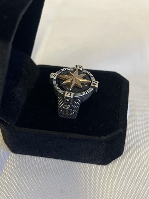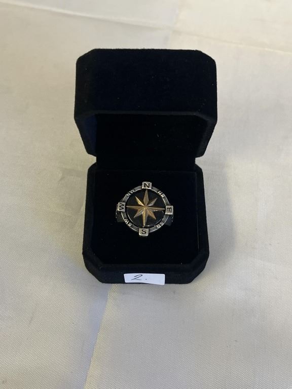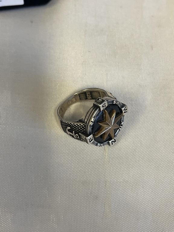 SOLID VINTAGE STERLING SILVER COMPASS RING, W/ GOLD STAR CENTER, MARKED 925 BS SIZE 9