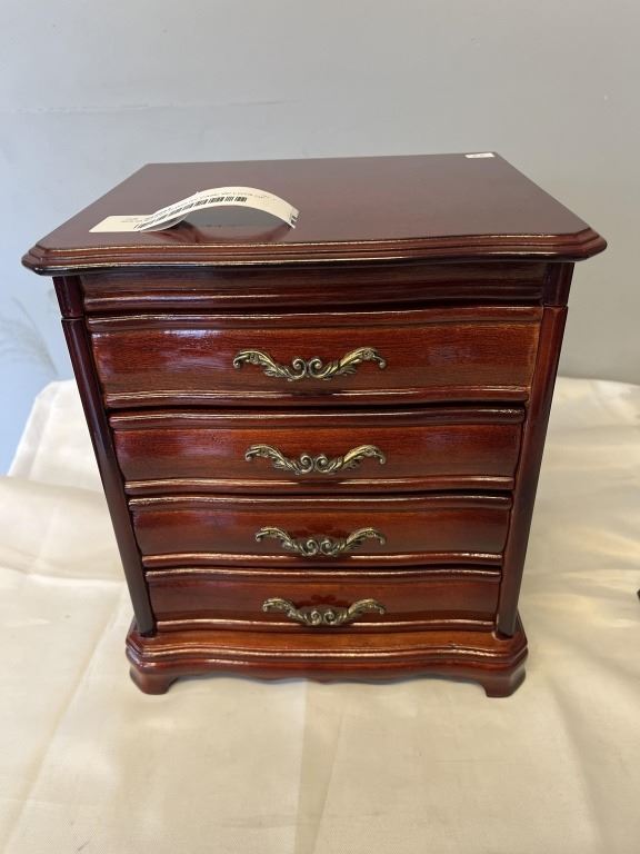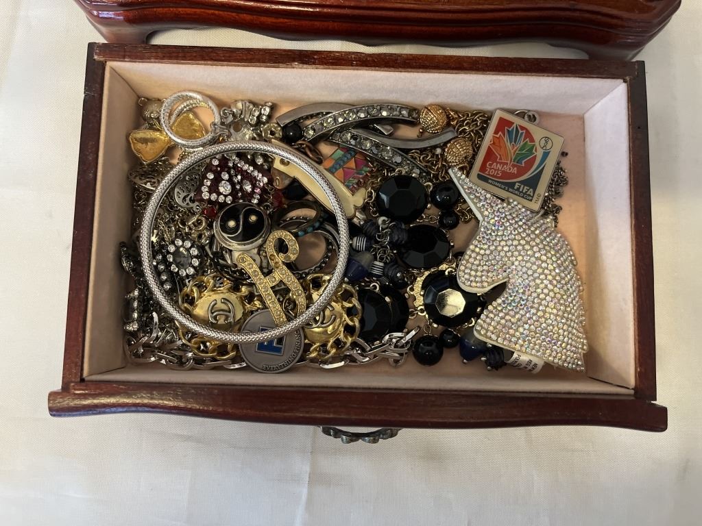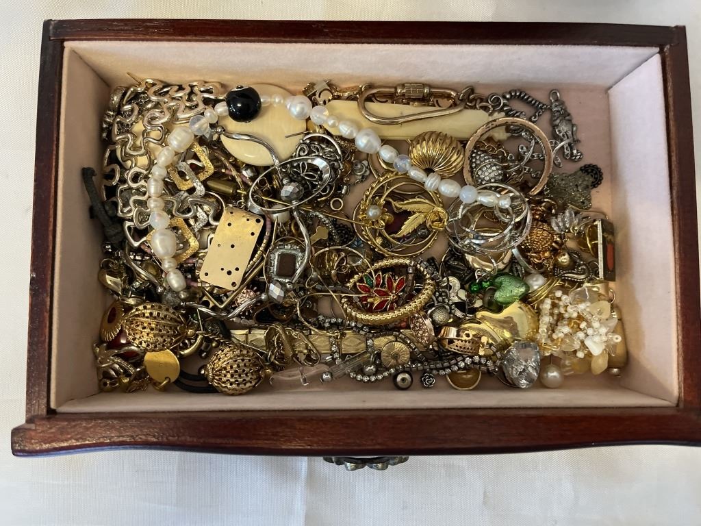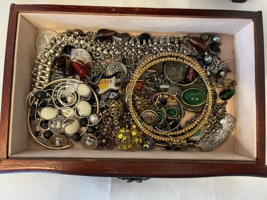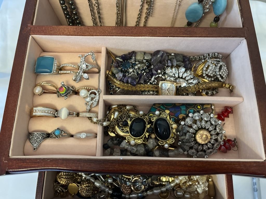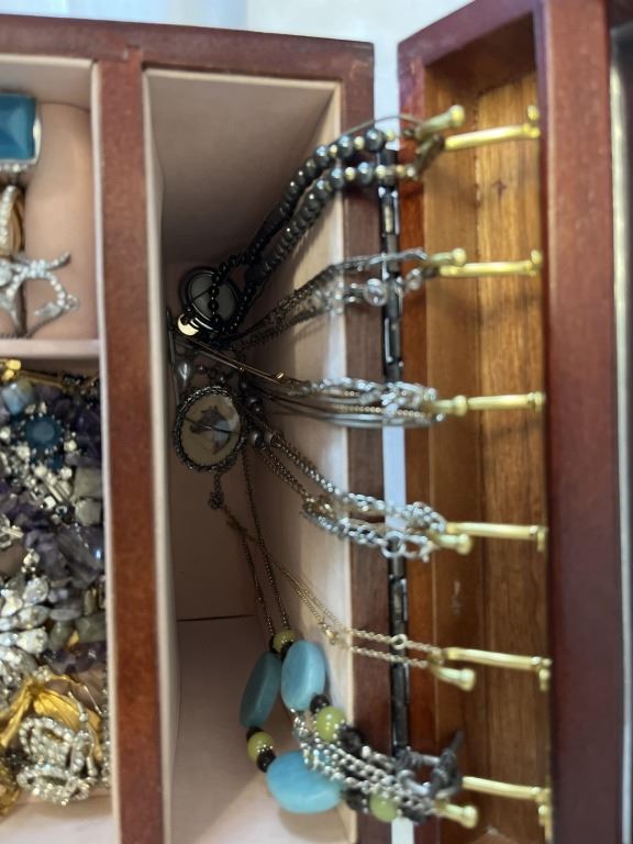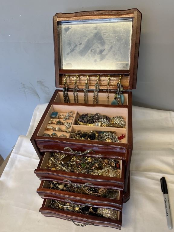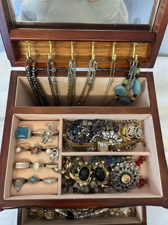 SOLID WOOD JEWELRY CASE W/ LOTS OF CONTENTS