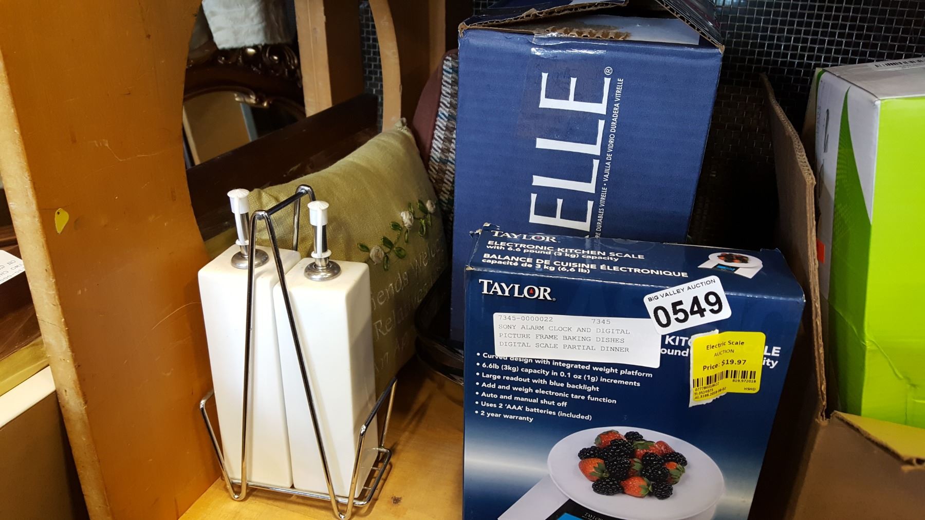 SONY ALARM CLOCK AND DIGITAL PICTURE FRAME BAKING DISHES DIGITAL SCALE PARTIAL DINNER SET CLOCKS FRAMES AND TWO SMALL PILLOWS