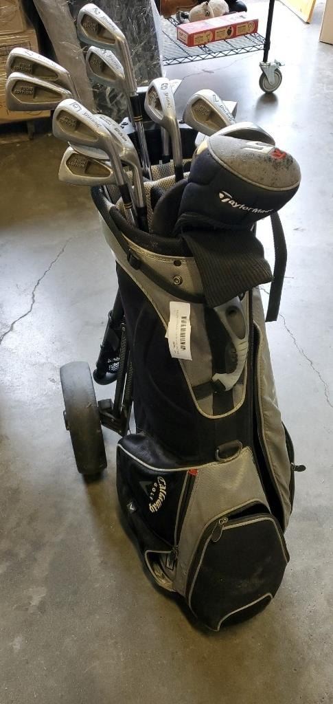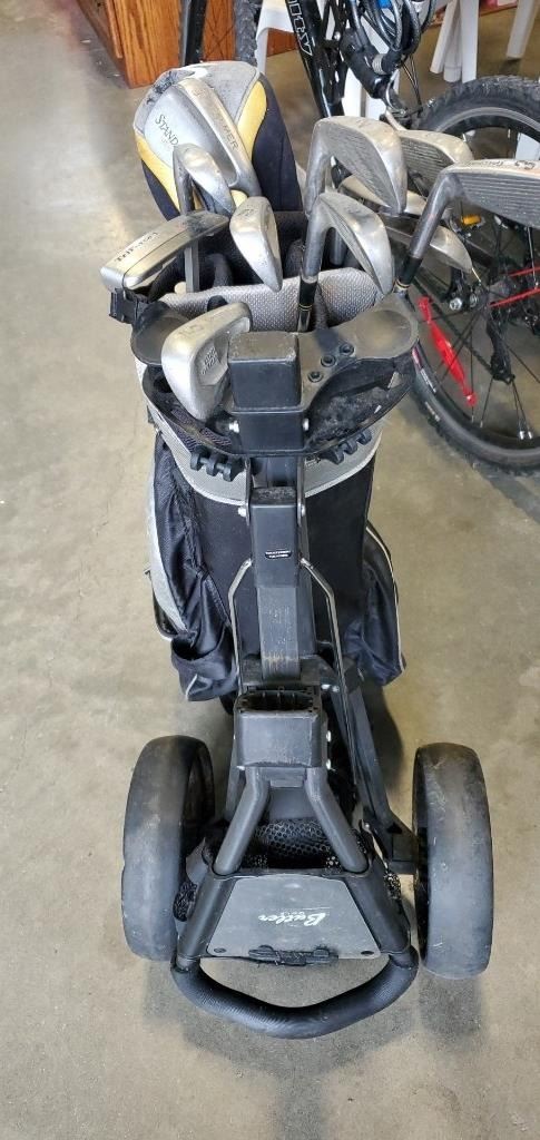 SPALDING GOLF CLUBS, ODYSSEY PUTTER, BAG AND FOLDING CART