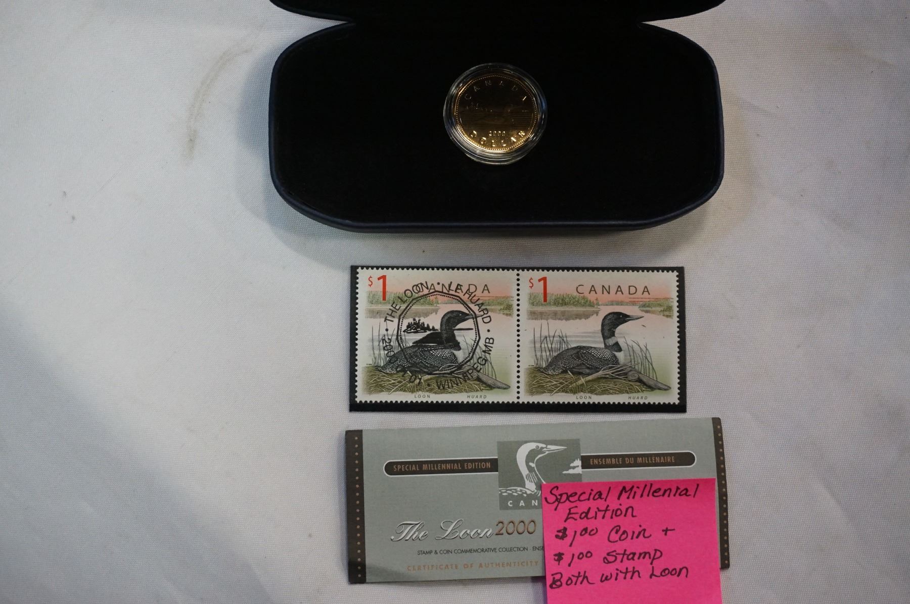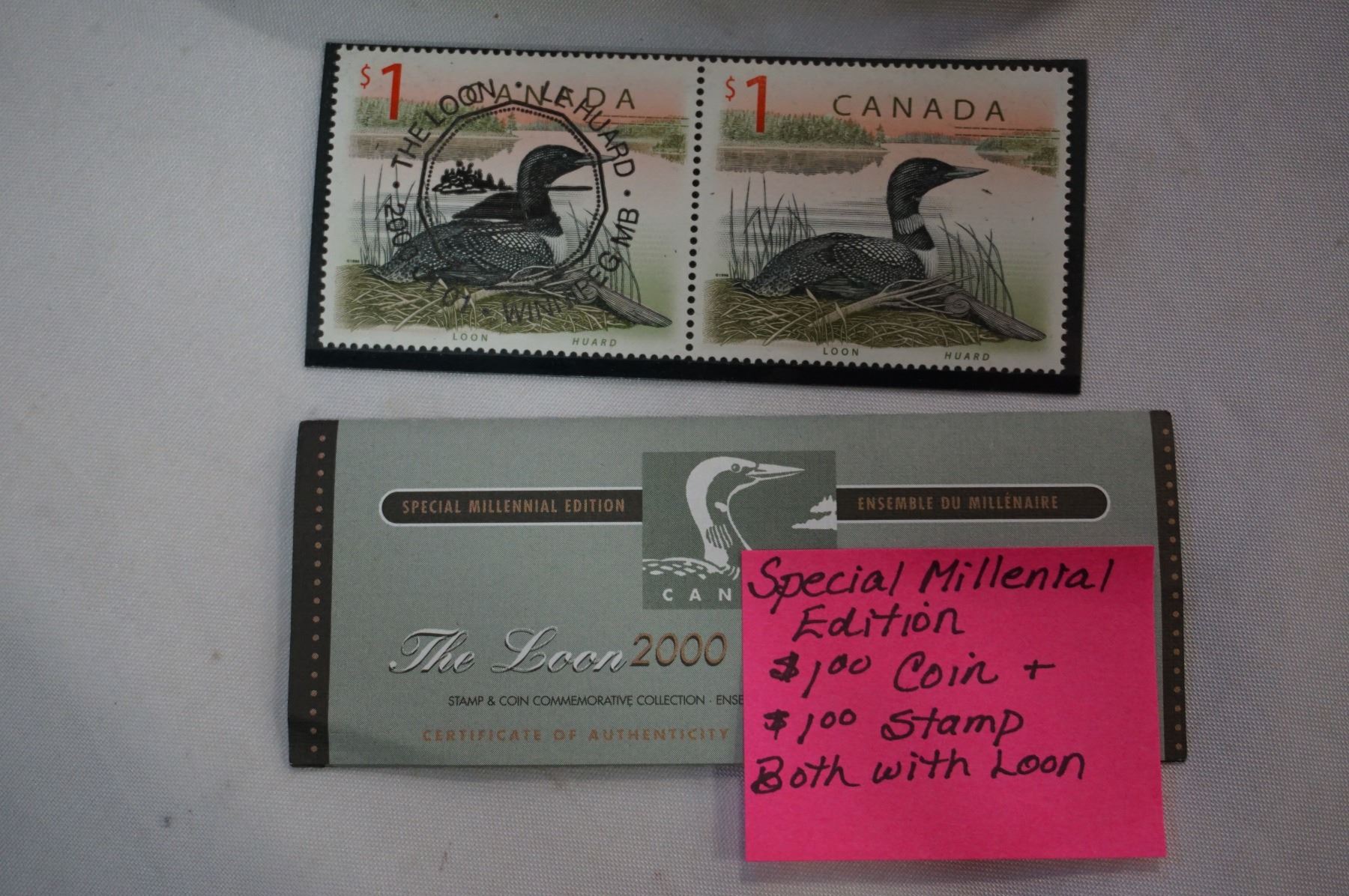 SPECIAL EDITION MILLENIAL STAMP AND COIN MINT IN CASE LOONIE PLUS ONE DOLLAR STAMP WITH LOON