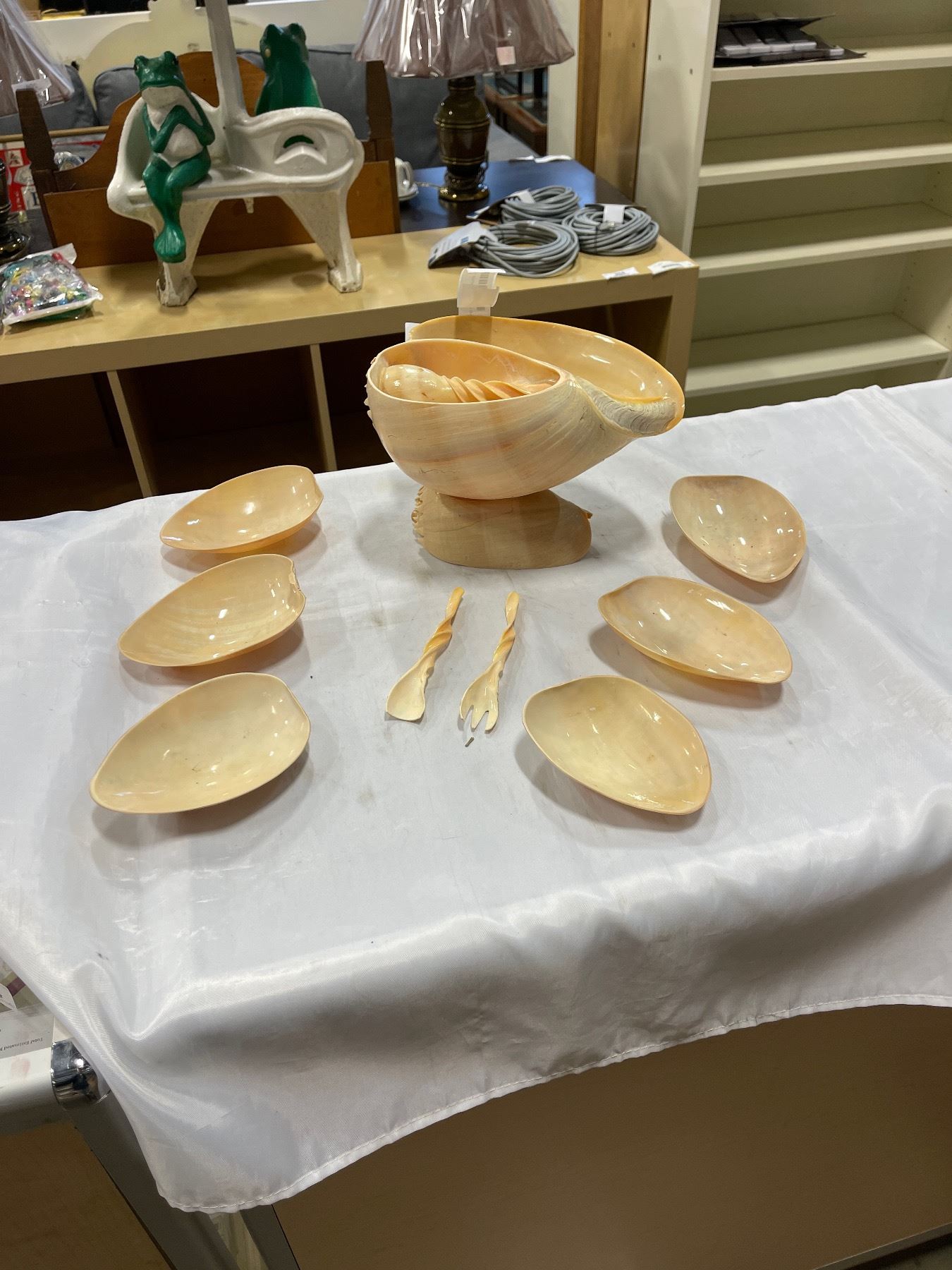 SPIRAL SHELL SERVING DISH WITH SHELL BOWLS AND FORK AND SPOON