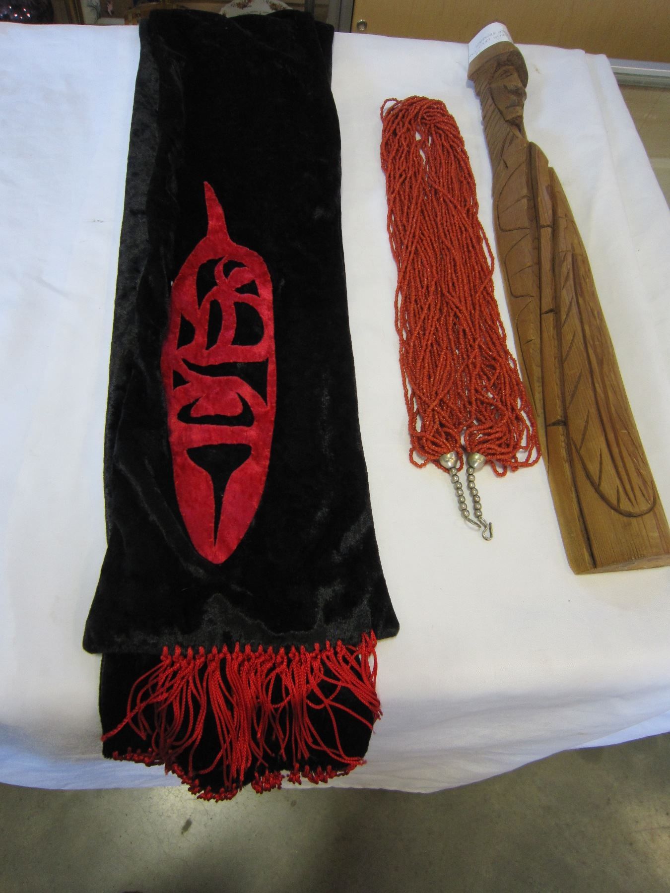 SQUAMISH NATIVE CHEIF CARVING, SCARF, BEADED NECKLACE