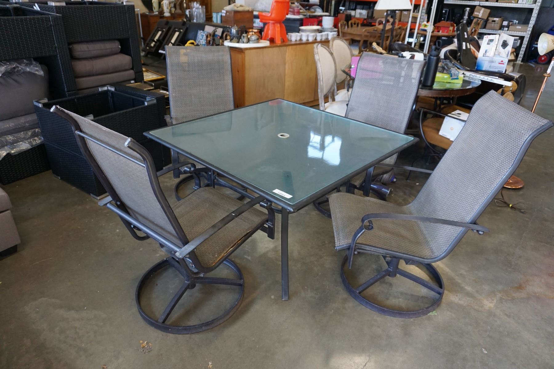 SQUARE GLASSTOP PATIO TABLE AND 4 SWIVEL CHAIRS