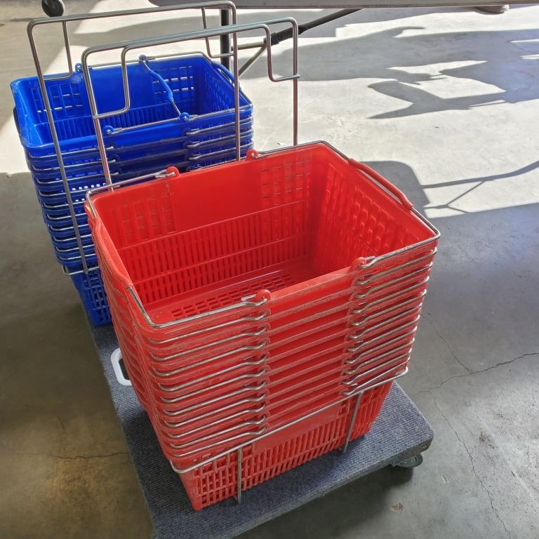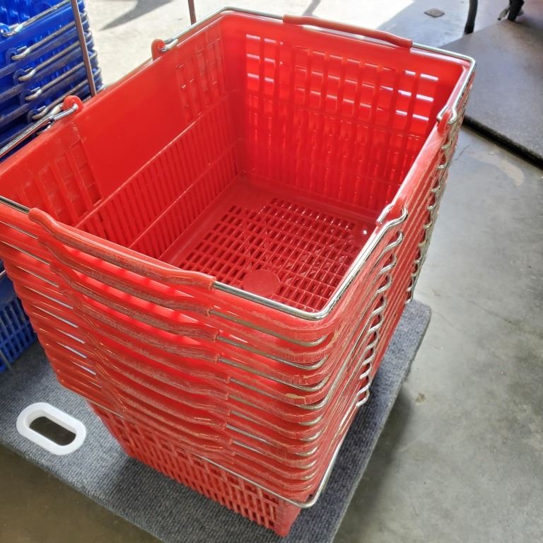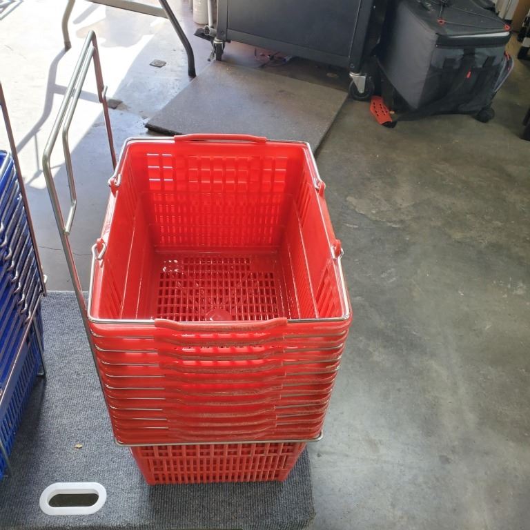 STACK OF 11 RED SHOPPING BASKETS IN HOLDERS