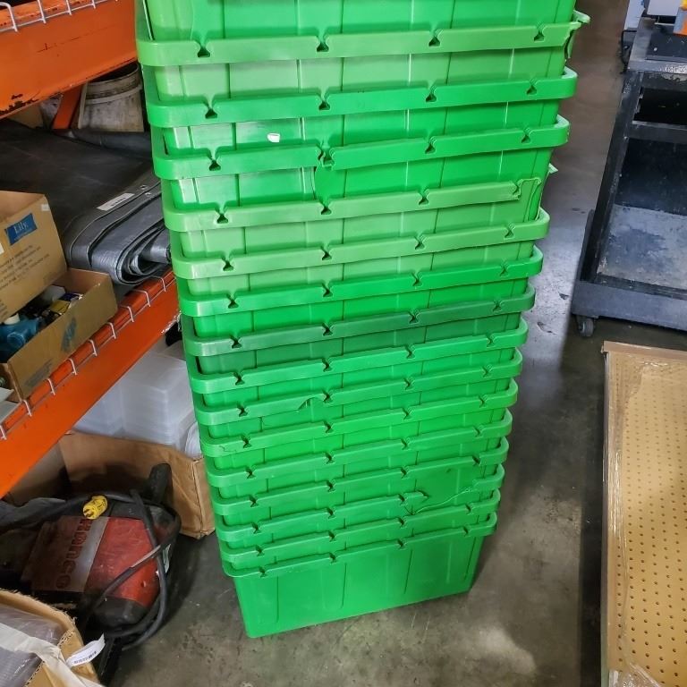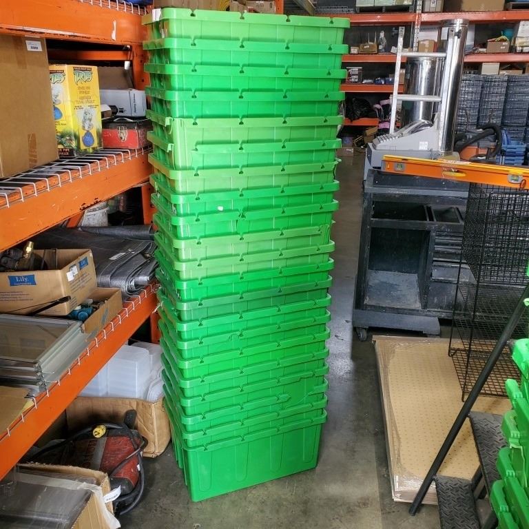 STACK OF 21 GREEN STORAGE TOTES RANGE FROM GOOD TO POOR