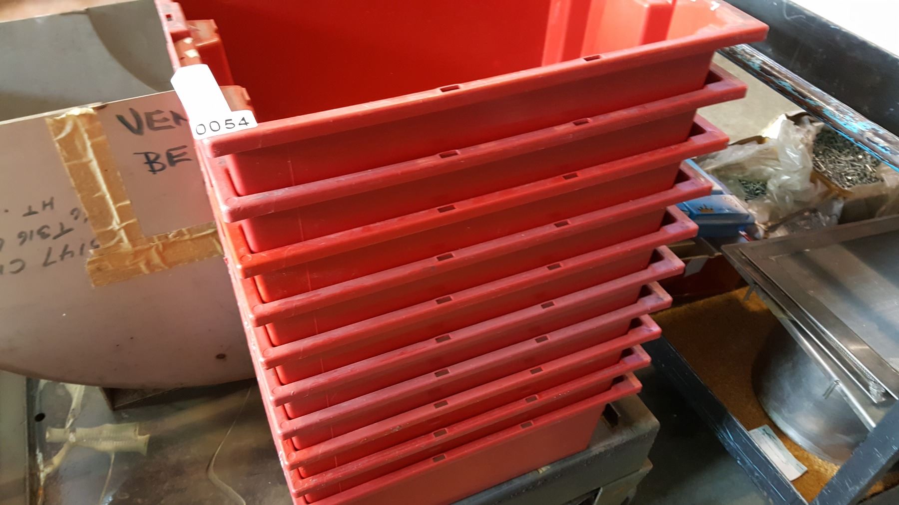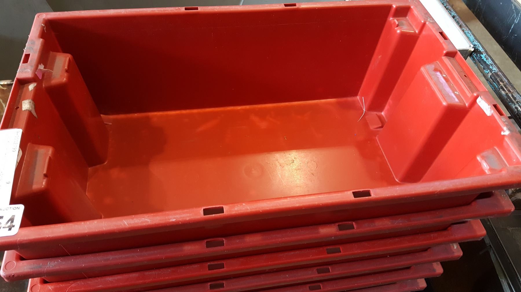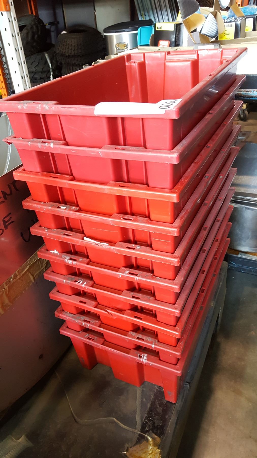 STACK OF RED STORAGE TOTES