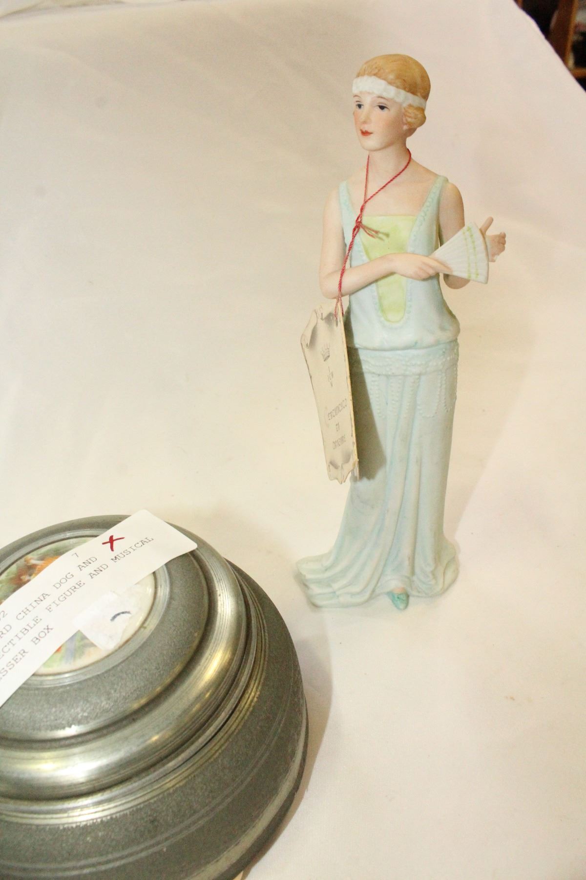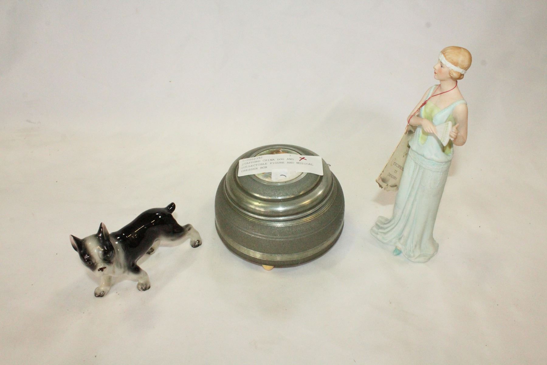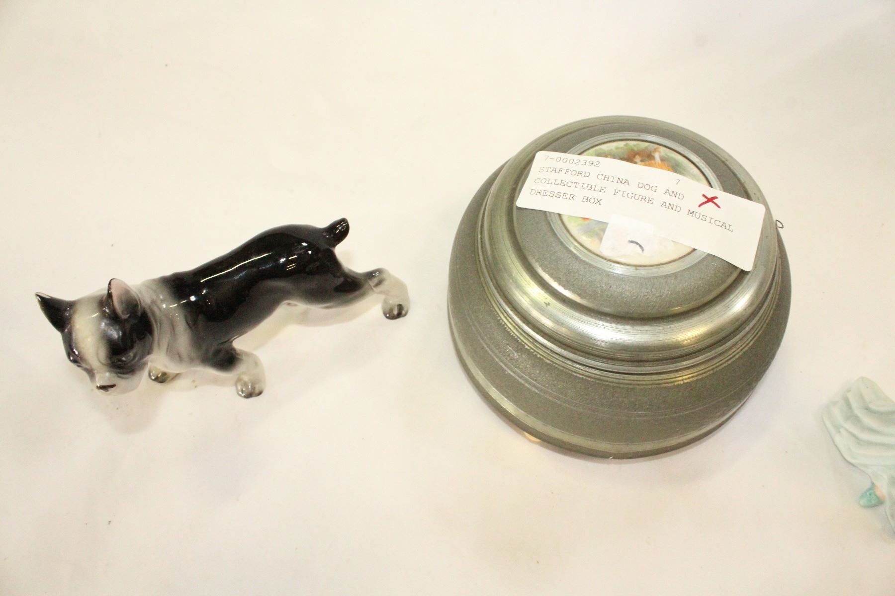 STAFFORD CHINA DOG AND COLLECTIBLE FIGURE AND MUSICAL DRESSER BOX