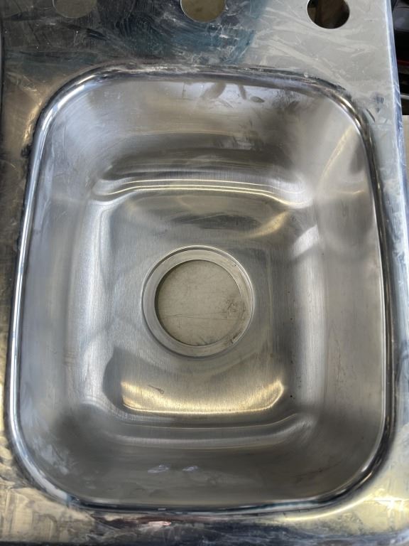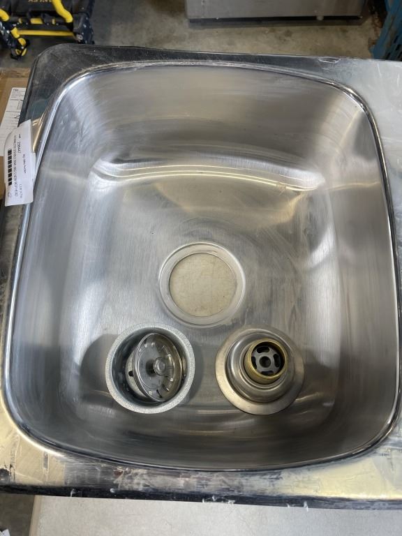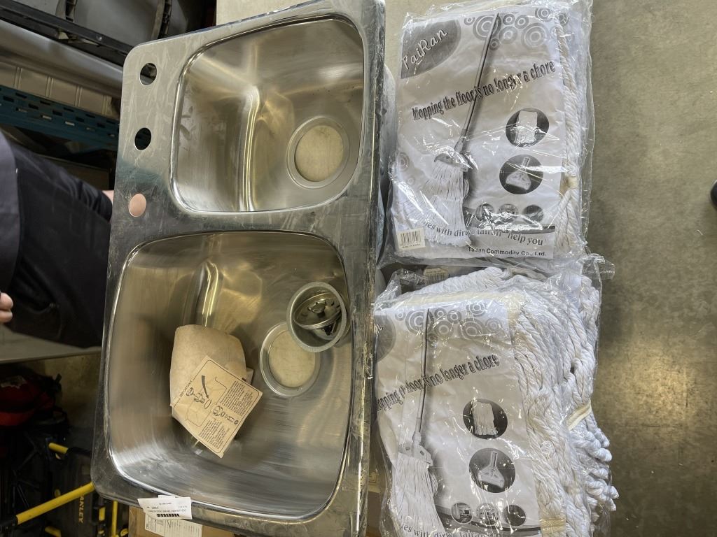 STAINLESS DOUBLE SINK AND 5 NEW MOP HEAD REPLACEMENTS