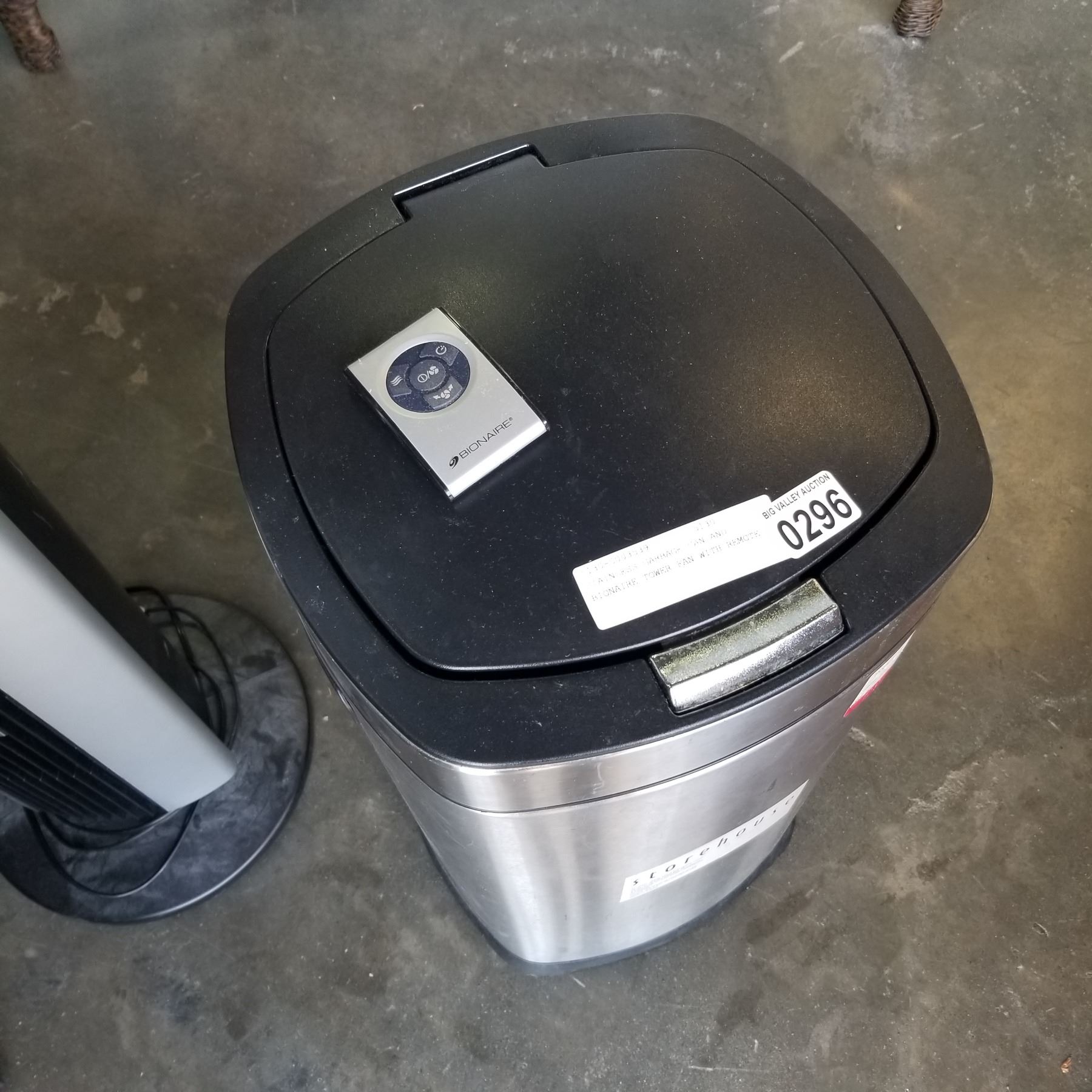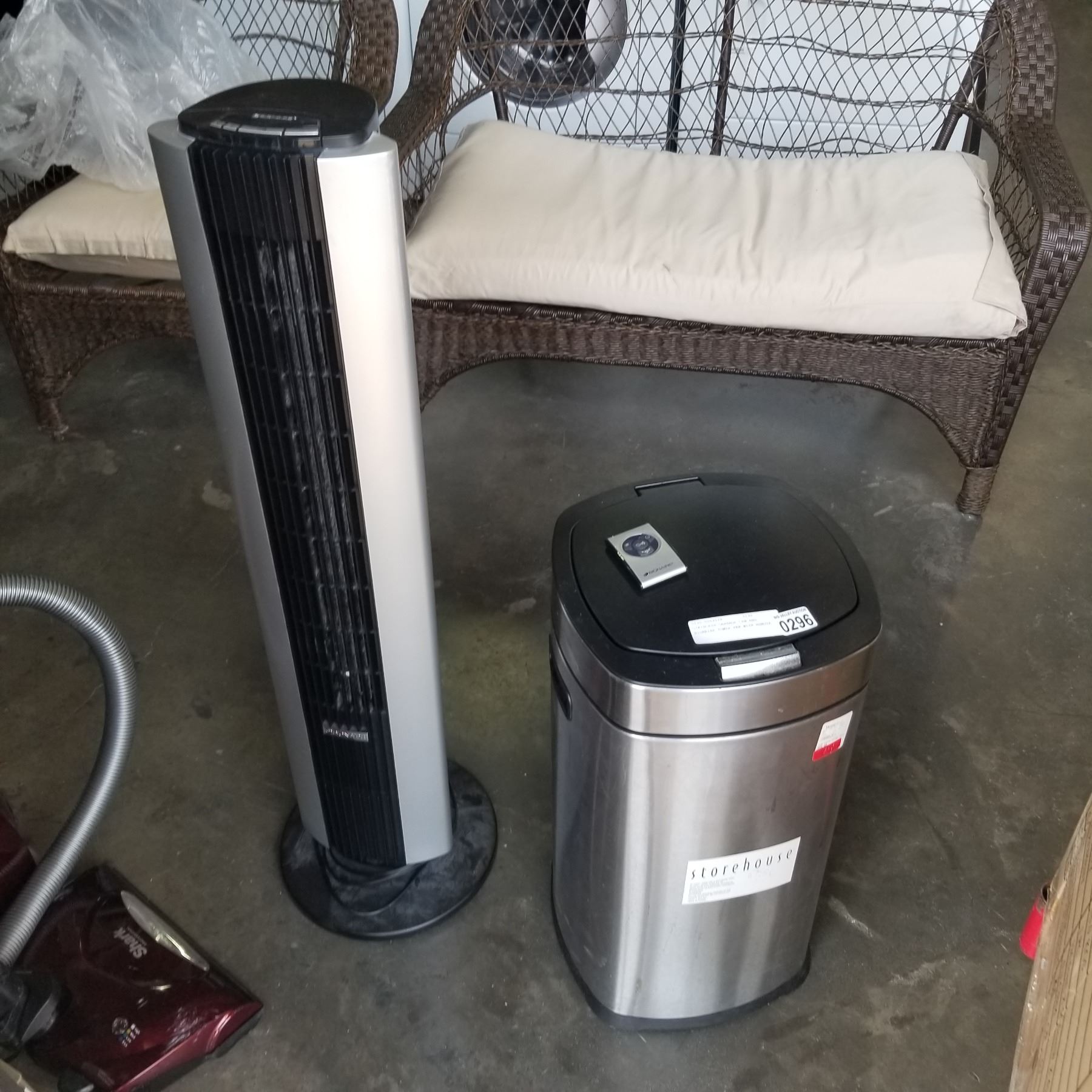 STAINLESS GARBAGE CAN AND BIONAIRE TOWER FAN WITH REMOTE